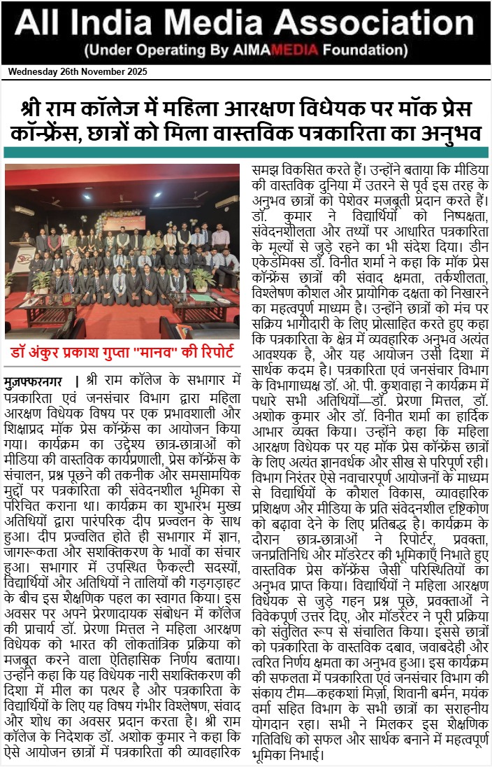 श्री राम कॉलेज के सभागार में पत्रकारिता एवं जनसंचार विभाग द्वारा महिला आरक्षण विधेयक विषय पर एक प्रभावशाली और शिक्षाप्रद मॉक प्रेस कॉन्फ्रेंस का आयोजन किया गया। कार्यक्रम का उद्देश्य छात्र-छात्राओं को मीडिया की वास्तविक कार्यप्रणाली, प्रेस कॉन्फ्रेंस के संचालन, प्रश्न पूछने की तकनीक और समसामयिक मुद्दों पर पत्रकारिता की संवेदनशील भूमिका से परिचित कराना था। कार्यक्रम का शुभारंभ मुख्य अतिथियों द्वारा पारंपरिक दीप प्रज्वलन के साथ हुआ। दीप प्रज्वलित होते ही सभागार में ज्ञान, जागरूकता और सशक्तिकरण के भावों का संचार हुआ। सभागार में उपस्थित फैकल्टी सदस्यों, विद्यार्थियों और अतिथियों ने तालियों की गड़गड़ाहट के बीच इस शैक्षणिक पहल का स्वागत किया। इस अवसर पर अपने प्रेरणादायक संबोधन में कॉलेज की प्राचार्य डॉ. प्रेरणा मित्तल ने महिला आरक्षण विधेयक को भारत की लोकतांत्रिक प्रक्रिया को मजबूत करने वाला ऐतिहासिक निर्णय बताया। उन्होंने कहा कि यह विधेयक नारी सशक्तिकरण की दिशा में मील का पत्थर है और पत्रकारिता के विद्यार्थियों के लिए यह विषय गंभीर विश्लेषण, संवाद और शोध का अवसर प्रदान करता है। श्री राम कॉलेज के निदेशक डॉ. अशोक कुमार ने कहा कि ऐसे आयोजन छात्रों में पत्रकारिता की व्यावहारिक समझ विकसित करते हैं। उन्होंने बताया कि मीडिया की वास्तविक दुनिया में उतरने से पूर्व इस तरह के अनुभव छात्रों को पेशेवर मजबूती प्रदान करते हैं। डॉ. कुमार ने विद्यार्थियों को निष्पक्षता, संवेदनशीलता और तथ्यों पर आधारित पत्रकारिता के मूल्यों से जुड़े रहने का भी संदेश दिया। डीन एकेडमिक्स डॉ. विनीत शर्मा ने कहा कि मॉक प्रेस कॉन्फ्रेंस छात्रों की संवाद क्षमता, तर्कशीलता, विश्लेषण कौशल और प्रायोगिक दक्षता को निखारने का महत्वपूर्ण माध्यम है। उन्होंने छात्रों को मंच पर सक्रिय भागीदारी के लिए प्रोत्साहित करते हुए कहा कि पत्रकारिता के क्षेत्र में व्यवहारिक अनुभव अत्यंत आवश्यक है, और यह आयोजन उसी दिशा में सार्थक कदम है। पत्रकारिता एवं जनसंचार विभाग के विभागाध्यक्ष डॉ. ओ. पी. कुशवाहा ने कार्यक्रम में पधारे सभी अतिथियों—डॉ. प्रेरणा मित्तल, डॉ. अशोक कुमार और डॉ. विनीत शर्मा का हार्दिक आभार व्यक्त किया। उन्होंने कहा कि महिला आरक्षण विधेयक पर यह मॉक प्रेस कॉन्फ्रेंस छात्रों के लिए अत्यंत ज्ञानवर्धक और सीख से परिपूर्ण रही। विभाग निरंतर ऐसे नवाचारपूर्ण आयोजनों के माध्यम से विद्यार्थियों के कौशल विकास, व्यावहारिक प्रशिक्षण और मीडिया के प्रति संवेदनशील दृष्टिकोण को बढ़ावा देने के लिए प्रतिबद्ध है। कार्यक्रम के दौरान छात्र-छात्राओं ने रिपोर्टर, प्रवक्ता, जनप्रतिनिधि और मॉडरेटर की भूमिकाए