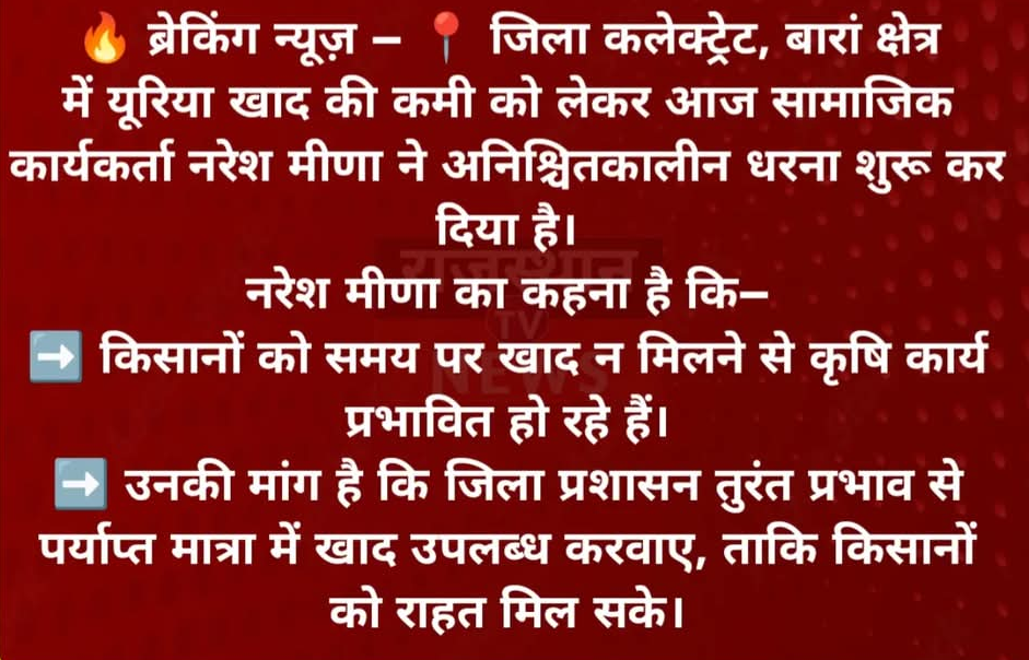 जिला कलेक्ट्री परिसर, बारां में यूरिया खाद की कमी को लेकर सामाजिक कार्यकर्ता नरेश मीणा ने आज अनिश्चितकालीन धरना शुरू किया। उनका कहना है कि समय पर खाद उपलब्ध न होने से किसानों के कृषि कार्य प्रभावित हो रहे हैं, जिससे रबी सीजन की बुवाई पर गंभीर असर पड़ रहा है।