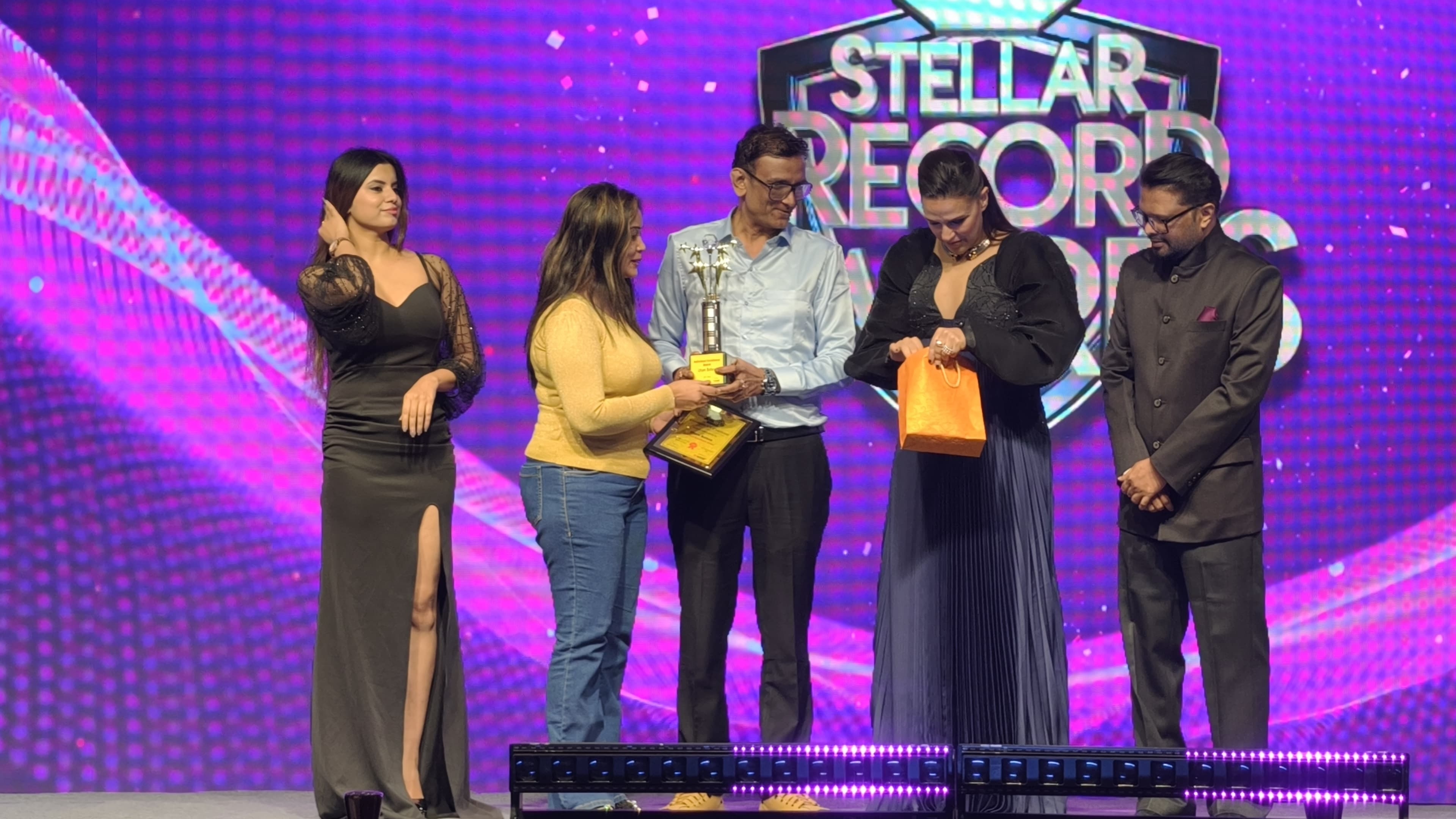 The Stellar Record Awards were held last night at Mumbai's renowned international hotel, The Westin. Many prominent businessmen and celebrities were present. Bollywood actress Neha Dhupia was the chief guest. Social worker and gold businessman Mr. Uttam Bafna was honored by Neha Dhupia. Uttam Bafna has performed numerous social service activities. He always serves those in need. Recognizing this service, he has been honored numerous times by prominent Bollywood celebrities. Uttam Bafna gave Neha Dhupia a wonderful gift, and Neha Dhupia heartily accepted it. Afterward, Uttam Bafna addressed everyone.