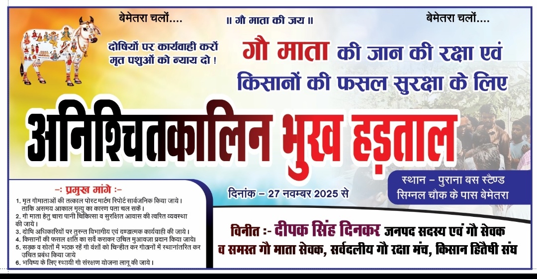 जिले में लगातार हो रही गौमाता की अकाल मृत्यु, चारा-पानी की किल्लत और किसानों की फसलों को हो रहे नुकसान के मुद्दे पर कांग्रेस ने मोर्चा खोलते हुए भूख हड़ताल का ऐलान किया है। जिला कांग्रेस कमेटी ने प्रेस विज्ञप्ति जारी कर बताया कि 28 नवम्बर, शुक्रवार दोपहर 12:30 बजे सिग्नल चौक, बेमेतरा में जनपद पंचायत बेमेतरा के सदस्य दीपक सिंह दिनकर प्रशासन की “कुंभकर्णी नींद” तोड़ने के लिए भूख हड़ताल पर बैठेंगे।