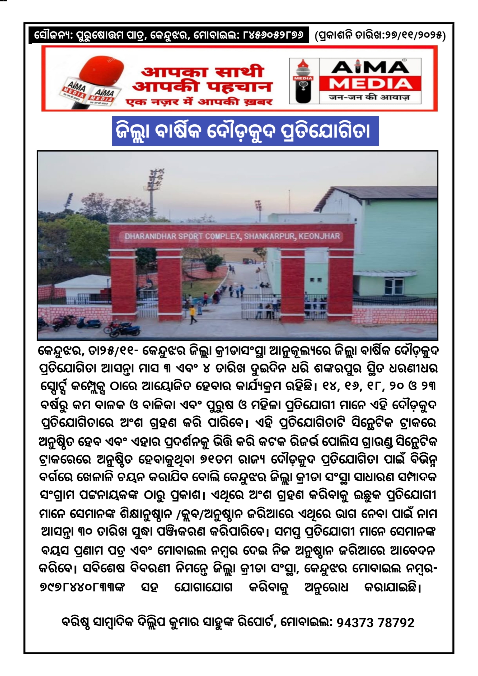 ଜିଲ୍ଲା ବାର୍ଷିକ ଦୌଡ଼କୁଦ ପ୍ରତିଯୋଗିତା ----------------------------------------------କେନ୍ଦୁଝର, ତା୨୫/୧୧- କେନ୍ଦୁଝର ଜିଲ୍ଲା କ୍ରୀଡାସଂସ୍ଥା ଆନୁକୂଲ୍ୟରେ ଜିଲ୍ଲା ବାର୍ଷିକ ଦୌଡ଼କୁଦ ପ୍ରତିଯୋଗିତା ଆସନ୍ତା ମାସ ୩ ଏବଂ ୪ ତାରିଖ ଦୁଇଦିନ ଧରି ଶଙ୍କରପୁର ସ୍ଥିତ ଧରଣୀଧର ସ୍ପୋର୍ଟ୍ସ କମ୍ପ୍ଲେକ୍ସ ଠାରେ ଆୟୋଜିତ ହେବାର କାର୍ଯ୍ୟକ୍ରମ ରହିଛି। ୧୪, ୧୬, ୧୮, ୨୦ ଓ ୨୩ ବର୍ଷରୁ କମ ବାଳକ ଓ ବାଳିକା ଏବଂ ପୁରୁଷ ଓ ମହିଳା ପ୍ରତିଯୋଗୀ ମାନେ ଏହି ଦୌଡ଼କୁଦ ପ୍ରତିଯୋଗିତାରେ ଅଂଶ ଗ୍ରହଣ କରି ପାରିବେ। ଏହି ପ୍ରତିଯୋଗିତାଟି ସିନ୍ଥେଟିକ ଟ୍ରାକରେ ଅନୁଷ୍ଠିତ ହେବ ଏବଂ ଏହାର ପ୍ରଦର୍ଶନକୁ ଭିତ୍ତି କରି କଟକ ରିଜର୍ଭ ପୋଲିସ ଗ୍ରାଉଣ୍ଡ ସିନ୍ଥେଟିକ ଟ୍ରାକରେରେ ଅନୁଷ୍ଠିତ ହେବାକୁଥିବା ୭୧ତମ ରାଜ୍ୟ ଦୌଡ଼କୁଦ ପ୍ରତିଯୋଗିତା ପାଇଁ ବିଭିନ୍ନ ବର୍ଗରେ ଖେଳାଳି ଚୟନ କରାଯିବ ବୋଲି କେନ୍ଦୁଝର ଜିଲ୍ଲା କ୍ରୀଡା ସଂସ୍ଥା ସାଧାରଣ ସମ୍ପାଦକ ସଂଗ୍ରାମ ପଟ୍ଟନାୟକଙ୍କ ଠାରୁ ପ୍ରକାଶ। ଏଥିରେ ଅଂଶ ଗ୍ରହଣ କରିବାକୁ ଇଛୁକ ପ୍ରତିଯୋଗୀ ମାନେ ସେମାନଙ୍କ ଶିକ୍ଷାନୁଷ୍ଠାନ /କ୍ଲବ/ଅନୁଷ୍ଠାନ ଜରିଆରେ ଏଥିରେ ଭାଗ ନେବା ପାଇଁ ନାମ ଆସନ୍ତା ୩୦ ତାରିଖ ସୁଦ୍ଧା ପଞ୍ଜିକରଣ କରିପାରିବେ। ସମସ୍ତ ପ୍ରତିଯୋଗୀ ମାନେ ସେମାନଙ୍କ ବୟସ ପ୍ରଣାମ ପତ୍ର ଏବଂ ମୋବାଇଲ ନମ୍ବର ଦେଇ ନିଜ ଅନୁଷ୍ଠାନ ଜରିଆରେ ଆବେଦନ କରିବେ। ସବିଶେଷ ବିବରଣୀ ନିମନ୍ତେ ଜିଲ୍ଲା କ୍ରୀଡା ସଂସ୍ଥା, କେନ୍ଦୁଝର ମୋବାଇଲ ନମ୍ବର- ୭୯୭୮୪୪୦୮୩୩ଙ୍କ ସହ ଯୋଗାଯୋଗ କରିବାକୁ ଅନୁରୋଧ କରାଯାଇଛି। ବରିଷ୍ଠ ସାମ୍ବାଦିକ ଦିଲ୍ଲିପ କୁମାର ସାହୁଙ୍କ ରିପୋର୍ଟ, ମୋବାଇଲ: 94373 78792