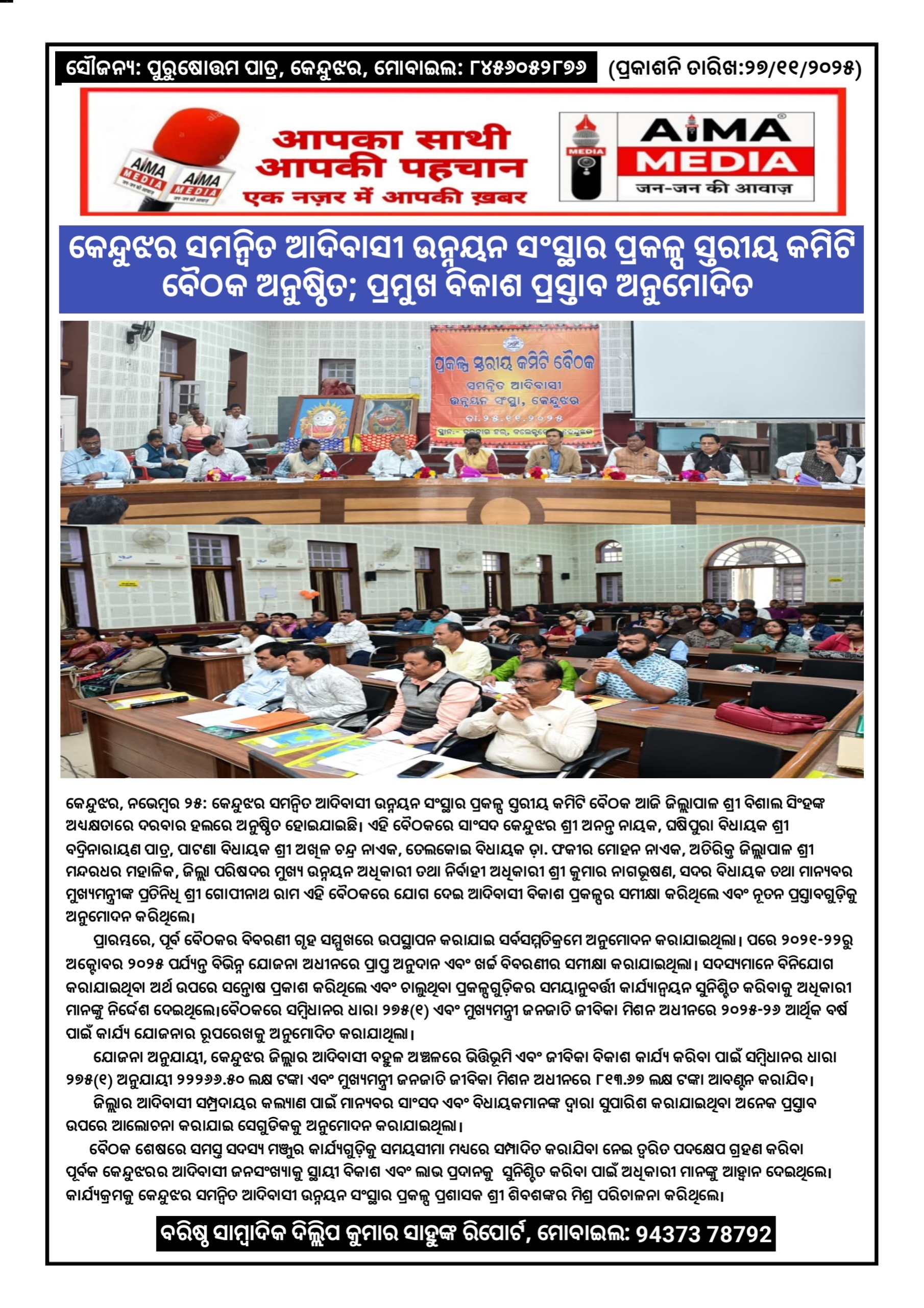 କେନ୍ଦୁଝର ସମନ୍ବିତ ଆଦିବାସୀ ଉନ୍ନୟନ ସଂସ୍ଥାର ପ୍ରକଳ୍ପ ସ୍ତରୀୟ କମିଟି ବୈଠକ ଅନୁଷ୍ଠିତ; ପ୍ରମୁଖ ବିକାଶ ପ୍ରସ୍ତାବ ଅନୁମୋଦିତ।