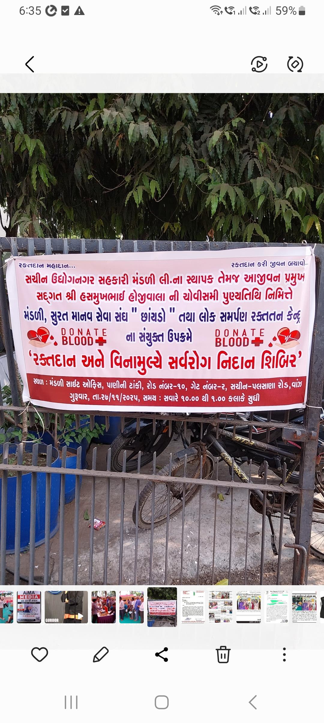 सचिन उद्योगनगर सहकारी मंडली लिमिटेड के संस्थापक तथा आजीवन अध्यक्ष स्वर्गीय हसमुखभाई होजीवाला की चौबीसवीं पुण्यतिथि के उपलक्ष्य में मंडली, सुरत मानव सेवा संघ “छायडो” और लोकसमर्पण रक्तदान केंद्र के संयुक्त उपक्रम से आज रक्तदान शिविर तथा निःशुल्क सर्वरोग निदान कैंप का भव्य आयोजन किया गया।