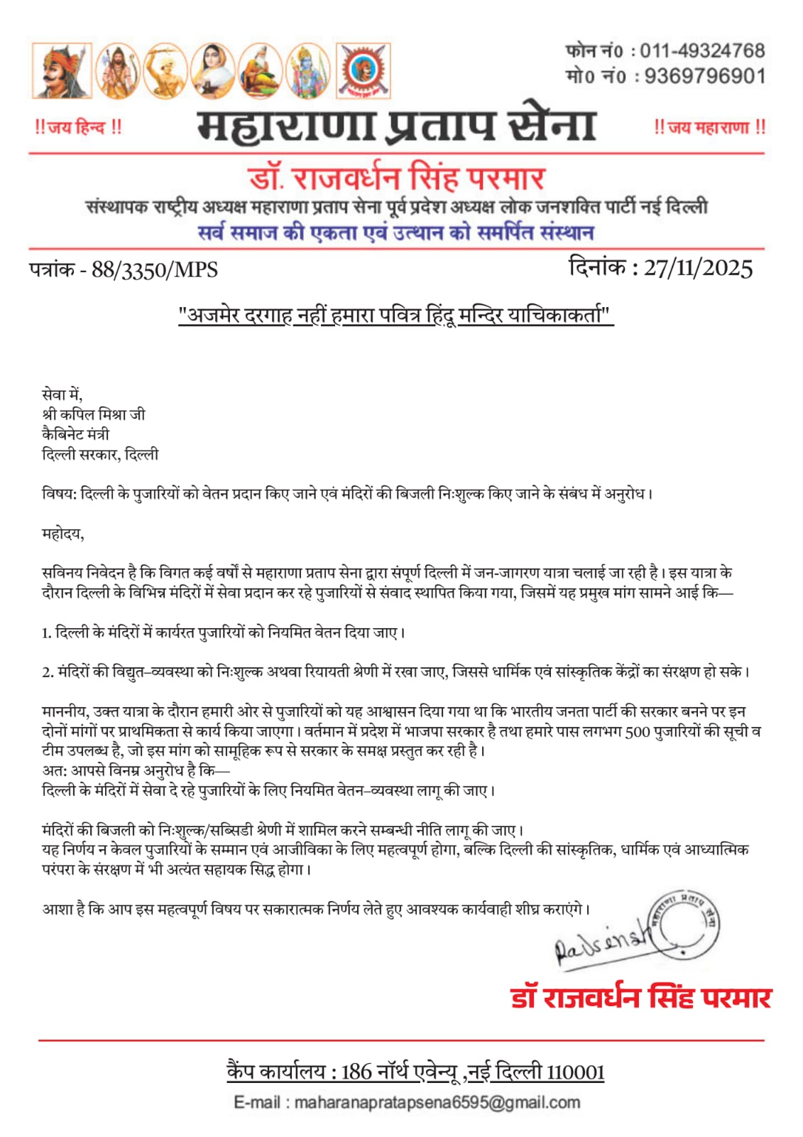 सविनय निवेदन है कि विगत कई वर्षों से महाराणा प्रताप सेना द्वारा संपूर्ण दिल्ली में जन-जागरण यात्रा चलाई जा रही है। इस यात्रा के दौरान दिल्ली के विभिन्न मंदिरों में सेवा प्रदान कर रहे पुजारियों से संवाद स्थापित किया गया, जिसमें यह प्रमुख मांग सामने आई कि-