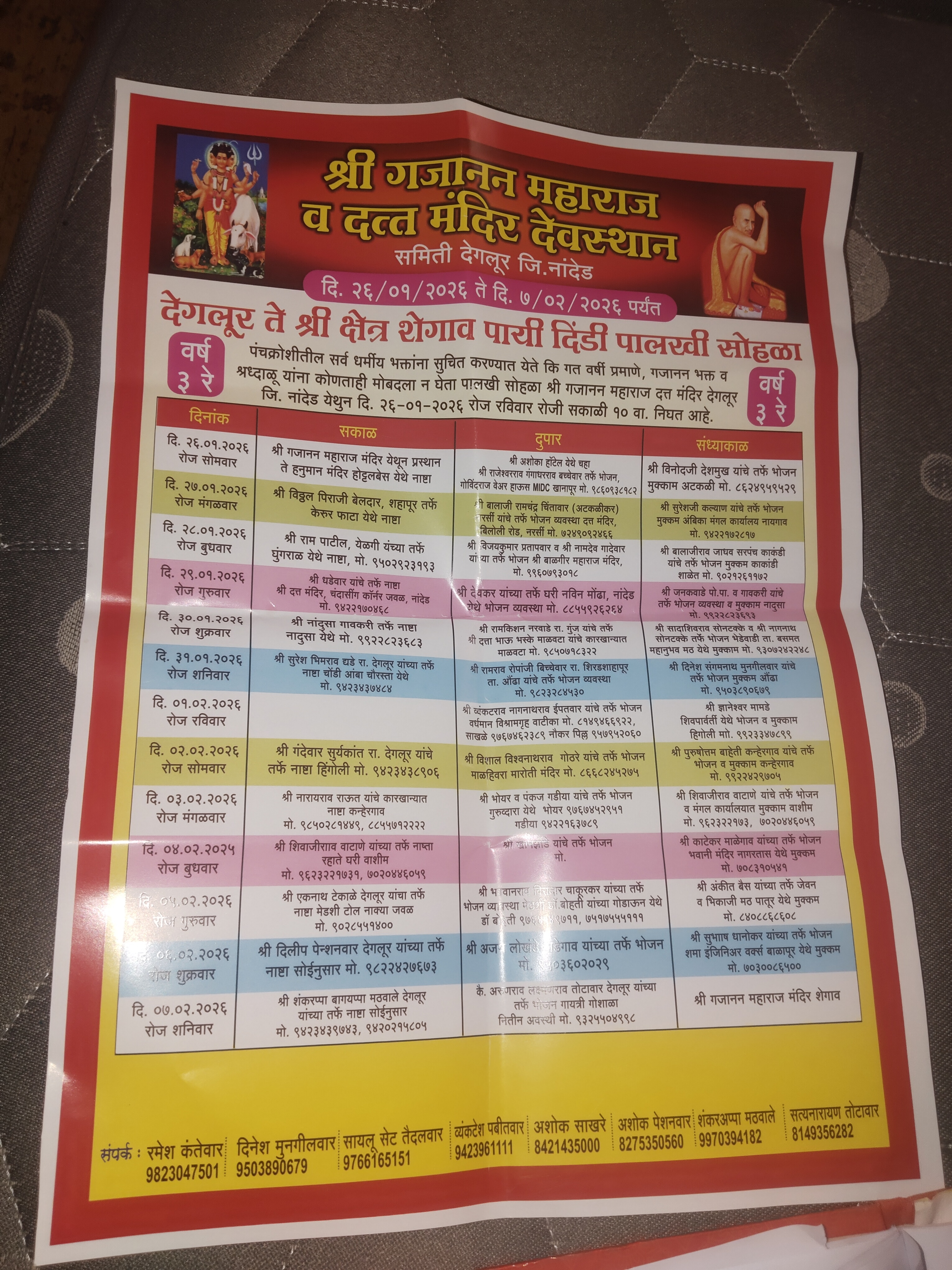 दिनांक 26 जानेवारी ते दिनांक 07 फेब्रुवारी 2026पर्यंत पायी दिंडी पालखी शेगावला दाखल होणार आहे टप्प्याटप्प्याने पायी दिंडी शेगाव पर्यंत जाणार आहे भक्तांची चहा नाश्ता व जेवणाची व राहण्याची व्यवस्था करण्यात आली आहे .या भक्तांना पायी दिंडी सोबत जायचे आहे त्यांनी संस्थांच्या वतीने श्री .रमेश कंतेवार ( माजी पोलीस उप -अधीक्षक तथा राष्ट्रीय पत्रकार संघ भारत संघटना महाराष्ट्र राज्य कार्यकारणी सदस्य व संस्थान चे अध्यक्ष ) मो नंः9823047501, श्री . सायलू तैदलवार 9766165151, श्री.व्यंकटेश पबितवार 9423961111, श्री.दिनेश मुनगीलवार9503890679,श्री .अशोक पेन्शलवार 8275350560, श्री.शंकराप्पा मठवाले 9970394182, श्री. अशोक साखरे 8421435000, श्री .सत्यनारायण तोटावार 81493556282, यांच्या कडे नाव नोदणी करावी असे आवाहन संस्थान तर्फे करण्यात आले आहे . श्री गजानन महाराज व श्री दत्तात्रय महाराज मंदीर संस्थान तर्फे अनेक उपक्रम दर वर्षी राबविण्यात येत आहेत .त्या उपक्रमाचे सर्वत्र कौतुक होत आहे .