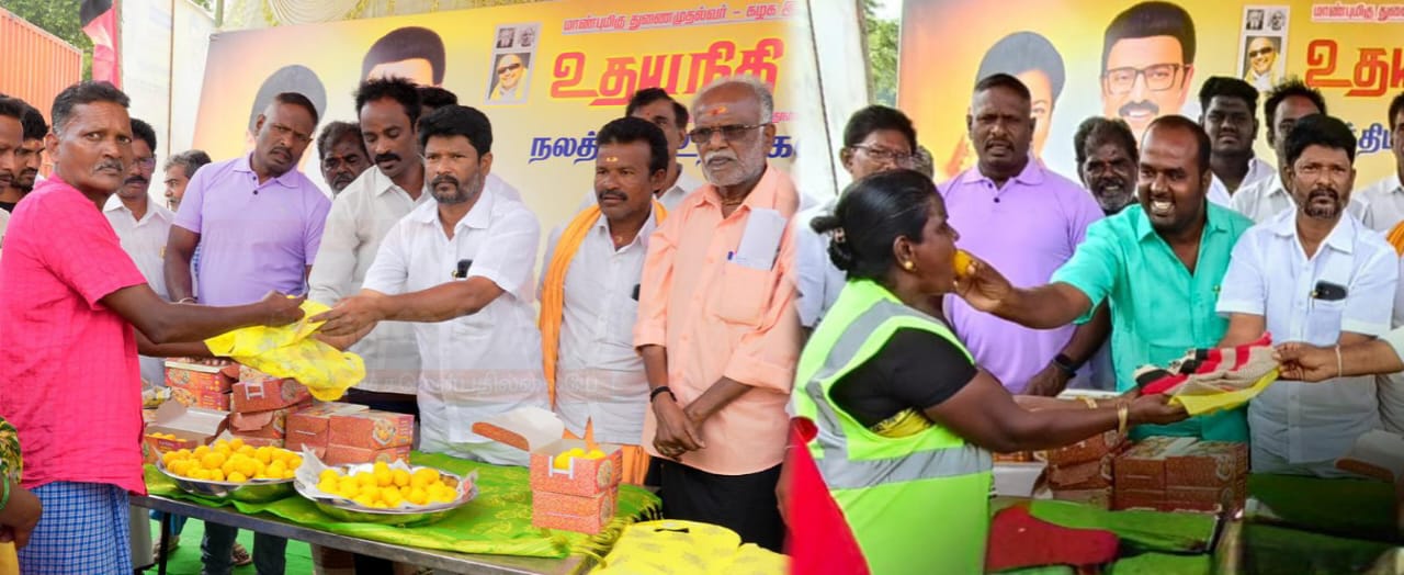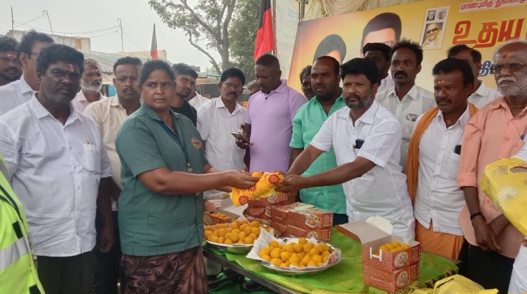 தமிழகத்தின் துணை முதல்வர் விளையாட்டுத்துறை அமைச்சர் உதயநிதி ஸ்டாலின் அவர்களின் பிறந்தநாளையொட்டி பூண்டி வடக்கு ஒன்றிய செயலாளர் ஜான் என்கின்ற பொன்னுசாமி தலைமையில் கும்மிடிப்பூண்டி தொகுதி பூண்டி ஒன்றியத்துக்கு உட்பட்ட சீத்தஞ்சேரி பகுதியில் தூய்மை பணியாளர்களுக்கு புத்ததாடைகள் வழங்கியும் பொதுமக்களுக்கு இனிப்புகள் வழங்கியும் கொண்டாடினர்.