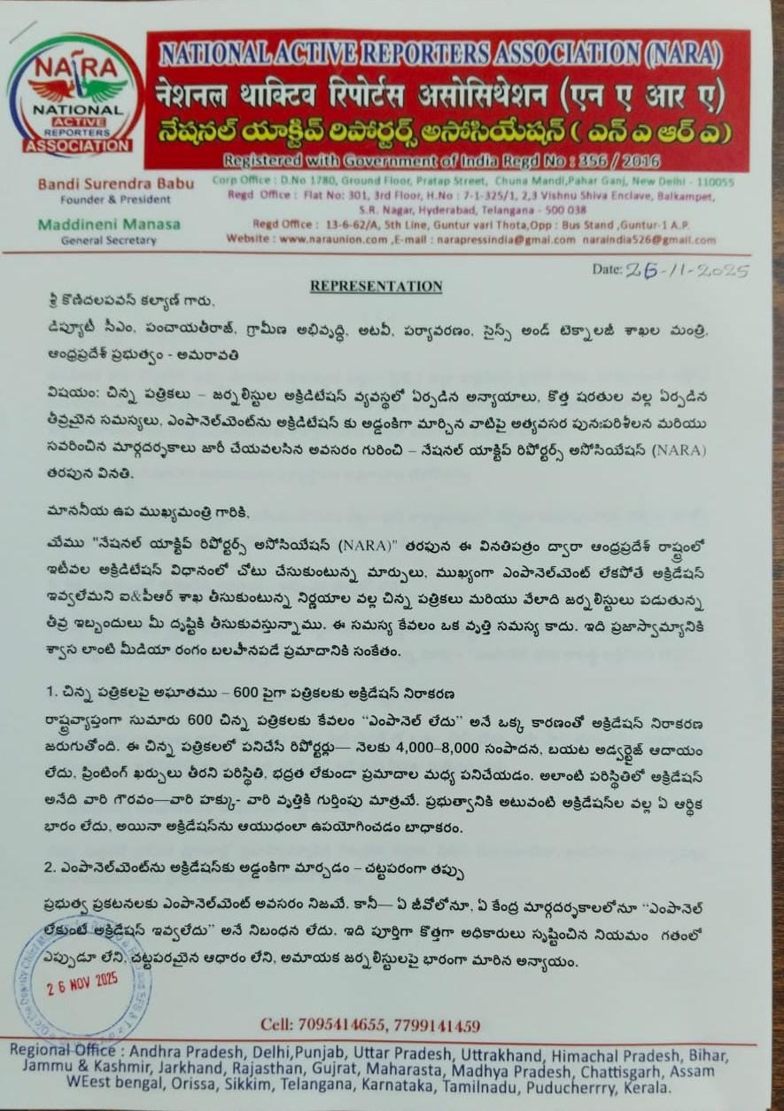 *విషయం:* చిన్న పత్రికలు – జర్నలిస్టుల అక్రిడిటేషన్ వ్యవస్థలో ఏర్పడిన అన్యాయాలు, కొత్త షరతుల వల్ల ఏర్పడిన తీవ్రమైన సమస్యలు, ఎంపానెల్‌మెంట్‌ను అక్రిడిటేషన్ కు అడ్డంకిగా మార్చిన వాటిపై అత్యవసర పునఃపరిశీలన మరియు సవరించిన మార్గదర్శకాలు జారీ చేయవలసిన అవసరం గురించి – నేషనల్ యాక్టివ్ రిపోర్టర్స్ అసోసియేషన్ (NARA) తరపున వినతి.