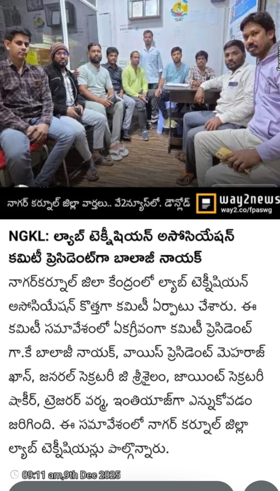 నాగర్‌కర్నూల్ జిలా ల్యాబ్ టెక్నీషియన్ అసోసియేషన్ కొత్తగ కమిటీ ఏర్పడడం జరిగింది, కమిటీ ప్రెసిడెంట్ గా.కే బాలాజీ నాయక్, వాయిస్ ప్రెసిడెంట్ మెహరాజ్ ఖాన్,