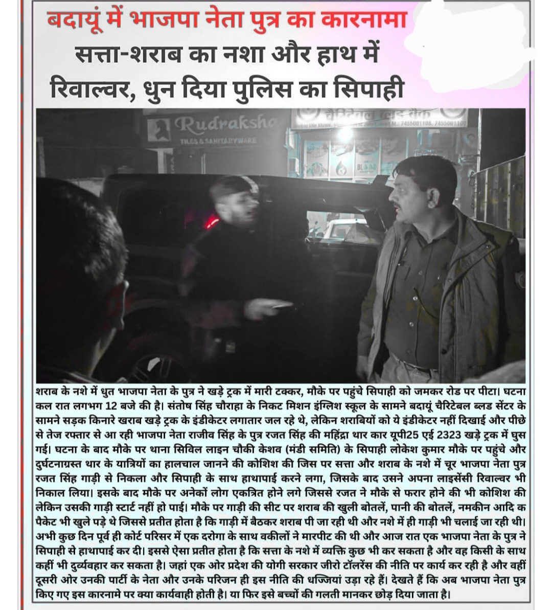 भाजपा नेता के पुत्र ने शराब पीकर सत्ता के नशे में पुलिसकर्मी को पिता मामला बदायूं का