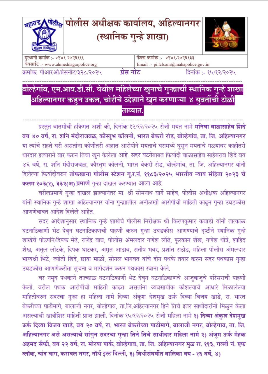 बोल्हेगांव, एम.आय.डी.सी. येथील महिलेच्या खुनाचे गुन्ह्याची स्थानिक गुन्हे शाखा अहिल्यानगर कडुन उकल, चोरीचे उद्देशाने खुन करणाऱ्या ४ युवतींची टोळी