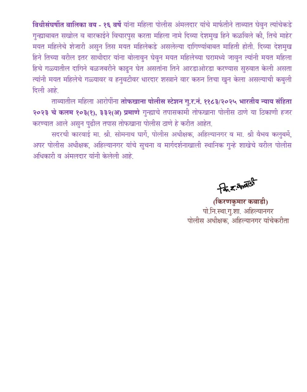 वर नमुद पथकाने तात्काळ घटनाठिकाणी भेट देवुन घटनाठिकाणचे आजुबाजुचे परिसराची पाहणी केली. वरील पथक आरोपींची माहिती काढत असतांना व्यवसायीक कौशल्याचे आधारे मिळालेल्या माहितीवरुन सदरचा गुन्हा हा महिला नामे दिव्या अंकुश देशमुख ऊर्फ दिव्या विजय खाडे, रा. भारत बेकरीच्या पाठीमागे, बालाजी नगर, बोल्हेगाव, ता.जि. अहिल्यानगर हिने तिचे इतर साथीदारांनी मिळून केला असल्याची खात्रीशिर माहिती प्राप्त झाली. दिनांक १५/१२/२०२५ रोजी महिला नामे १) दिव्या अंकुश देशमुख ऊर्फ दिव्या विजय खाडे, वय २० वर्षे, रा. भारत बेकरीच्या पाठीमागे, बालाजी नगर, बोल्हेगाव, ता. जि. अहिल्यानगर असे असल्याचे सांगुन सदरचा गुन्हा तिने तिचे साथीदार महिला नामे २) अंजुम ऊर्फ मेहक अहमद सैफी, वय २२ वर्षे, रा. मोरया पार्क, बोल्हेगाव, ता. जि. अहिल्यानगर मुळ रा. ११३, गल्ली नं. एफ ब्लॉक, चांद बाग, करावल नगर, नॉर्थ इस्ट दिल्ली, ३) विधीसंघर्षीत बालिका वय १६ वर्षे, ४) विधीसंघर्षीत बालिका वय १६ वर्षे यांना महिला पोलीस अंमलदार यांचे मार्फतीने ताब्यात घेवुन त्यांचेकडे गुन्ह्याबाबत सखोल व बारकाईने विचारपुस करता महिला नामे दिव्या देशमुख हिने कळविले की, तिचे माहेर मयत महिलेचे शेजारी असुन तिस मयत महिलेकडे असलेल्या दागिण्यांबाबत माहिती होती. दिव्या देशमुख हिने तिच्या वरील इतर साथीदार यांना बोलावुन घेवुन मयत महिलेच्या घरामध्ये जावुन त्यांनी मयत महिला हिचे गळ्यातील दागिने बळजबरीने काढुन घेत असतांना तिने आरडाओरडा करण्यास सुरुवात केली असता त्यांनी मयत महिलेचे गळ्यावर व हनुवटीवर धारदार शस्त्राने वार करुन तिचा खुन केला असल्याची कबुली दिली आहे.