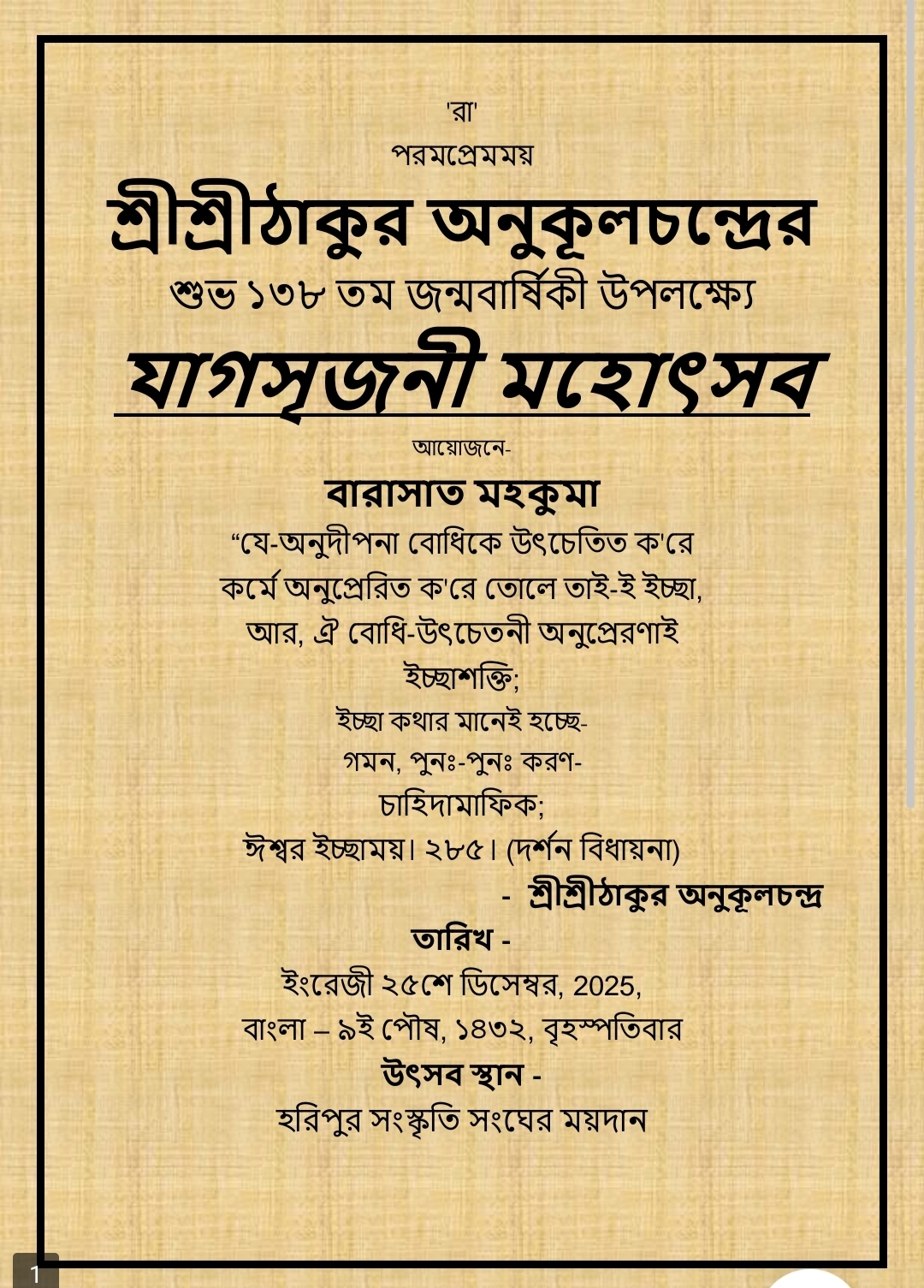 Shree shree Thakur Anukul Chandra 138 birthday celebration in India west bengal barasat on 25 december Haripur cultural community ground.