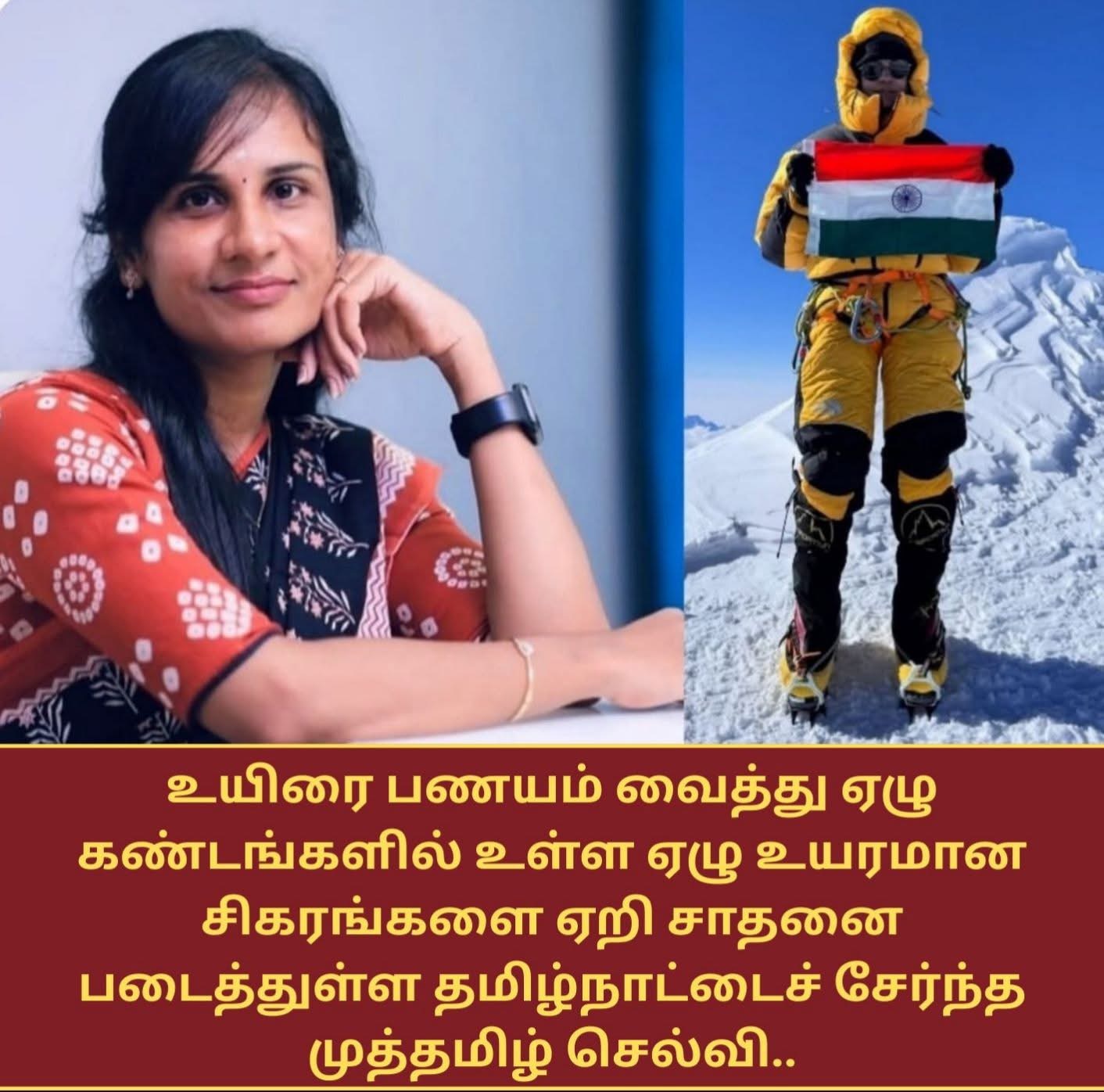 உயிரை பணயம் வைத்து ஏழு கண்டங்களில் உள்ள ஏழு உயரமான சிகரங்களை ஏறி சாதனை படைத்துள்ள தமிழ்நாட்டைச் சேர்ந்த முத்தமிழ் செல்வி.. #LatestNews #viral #trendingpost