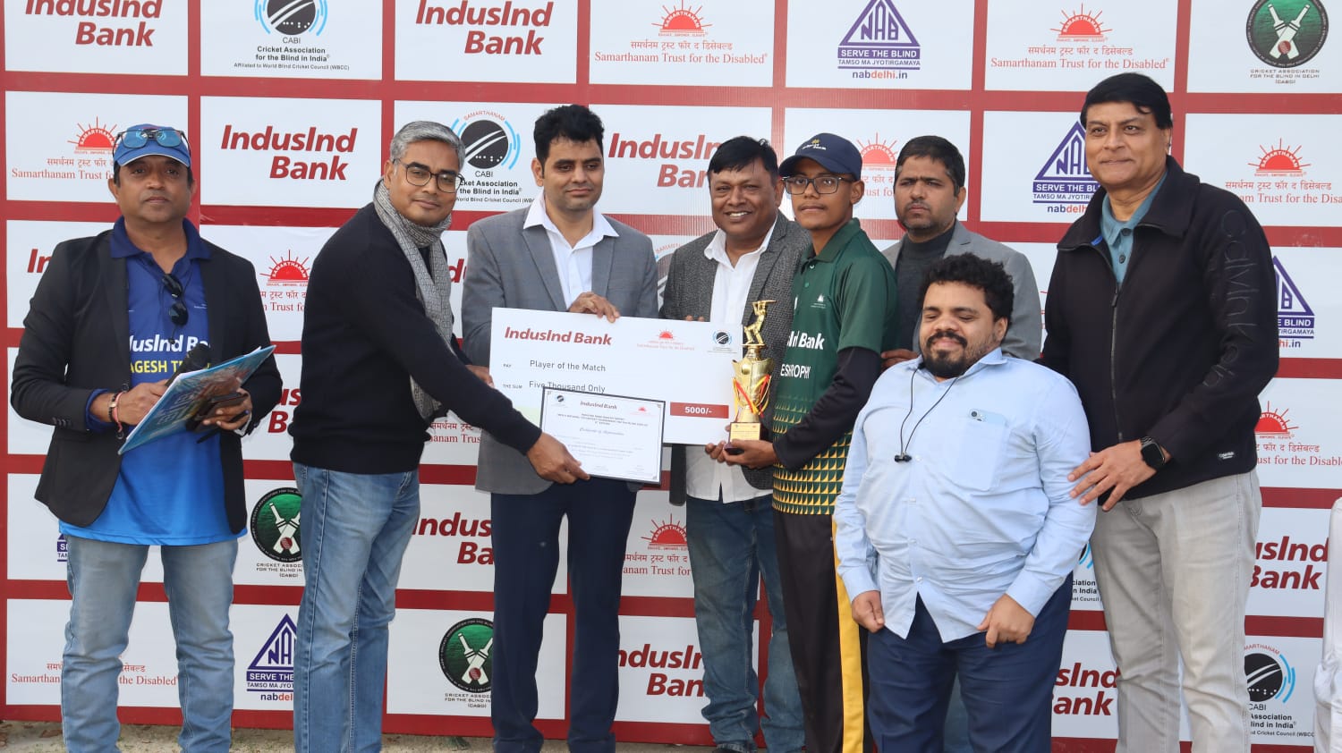 नागेश ट्रॉफी प्लेयर ऑफ द मैच की ट्रॉफी डेमो क्रिकेट दिखाते हुए सभी सदस्य