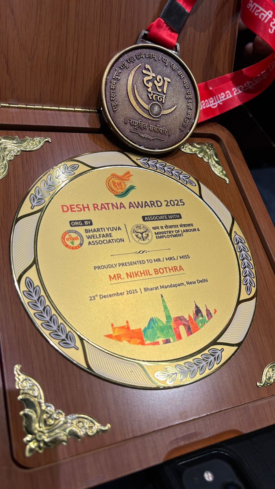 देश रत्न अवॉर्ड निखिल बोथरा को उनके राष्ट्र निर्माण में योगदान, युवाओं को प्रेरित करने वाले अभियानों और भारत की एकता को समर्पित कार्यों के लिए प्रदान किया गया। उनकी इंडिया बॉर्डरलाइन राइड 2025 ने देशभर में राष्ट्रीय एकता, अनुशासन, सड़क सुरक्षा और देशप्रेम का संदेश दिया, जिसके लिए उन्हें यह प्रतिष्ठित सम्मान मिला।