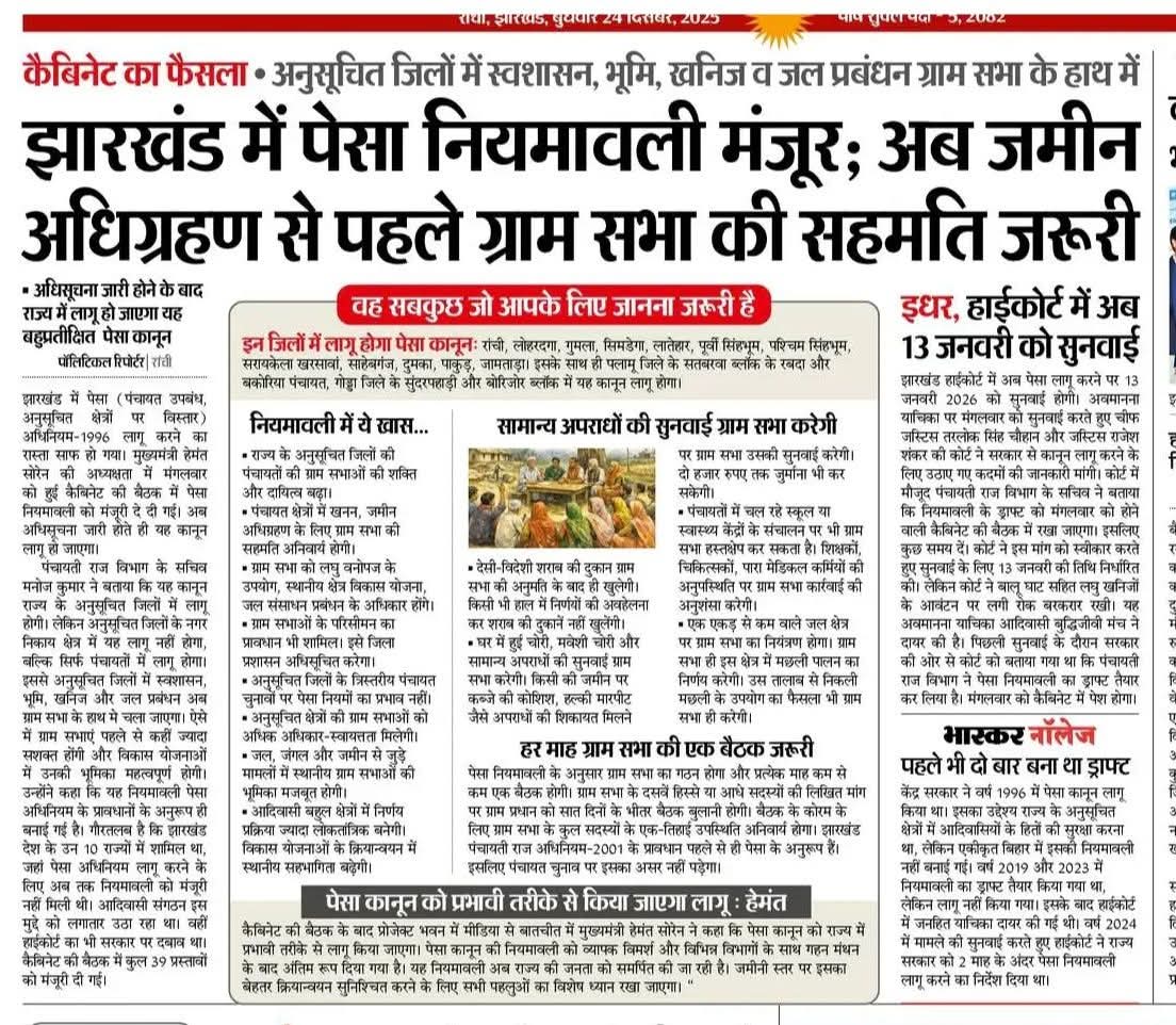 झारखंड में PESA नियमावली मंजूर अब अनुसूचित जिलों में जमीन अधिग्रहण से पहले ग्राम सभा की सहमति अनिवार्य होगी।