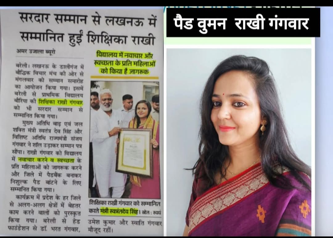 सरदार सम्मान से सम्मानित हुई शिक्षिका पैड वोमेन राखी गंगवार
