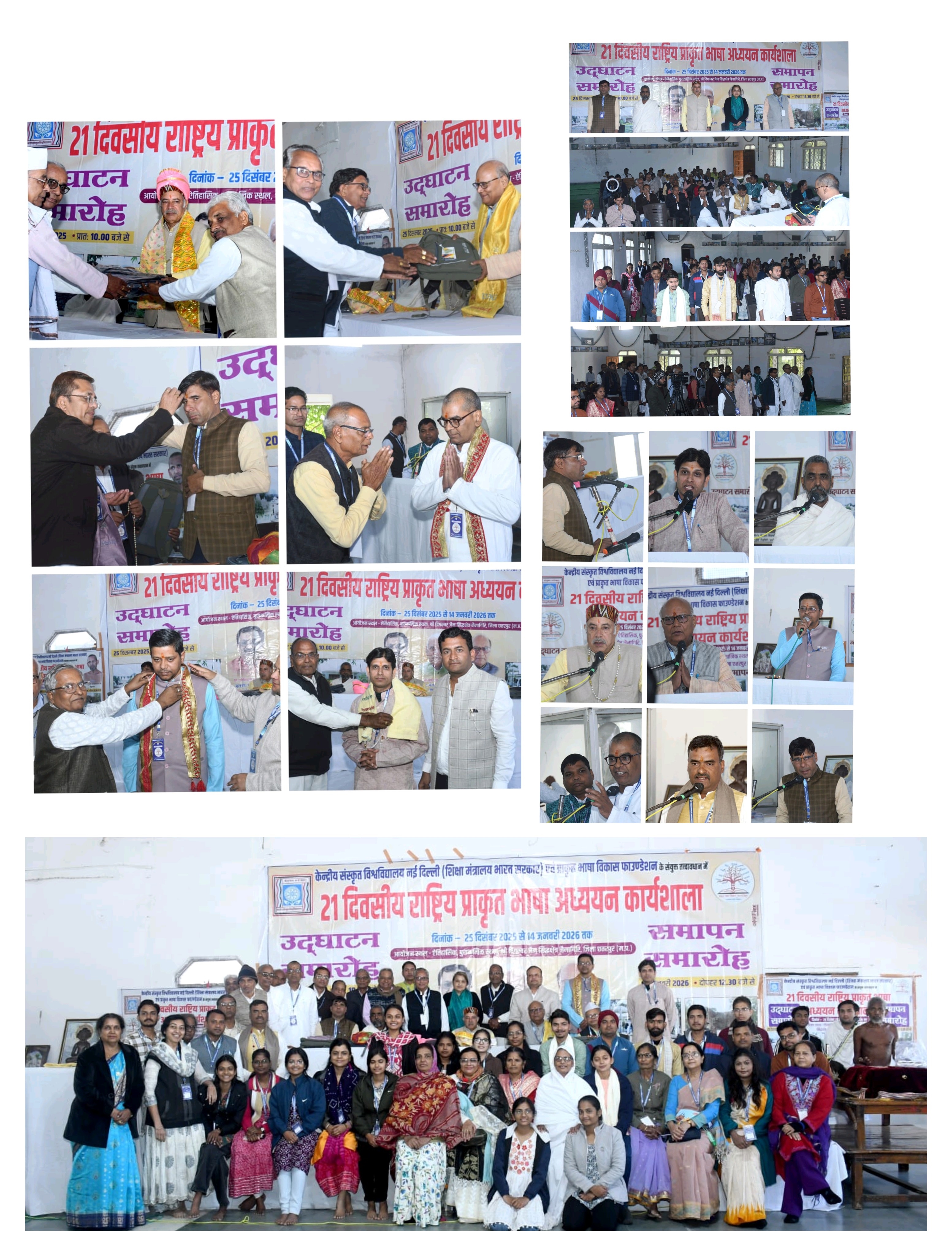 *नैनागिरि* ।। केन्द्रीय संस्कृत विश्वविद्यालय, नई दिल्ली (शिक्षा मंत्रालय, भारत सरकार) तथा प्राकृत भाषा विकास फाउण्डेशन के संयुक्त तत्वावधान में आयोजित *21 दिवसीय राष्ट्रीय प्राकृत भाषा अध्ययन कार्यशाला* का *उद्घाटन सत्र 25 दिसम्बर 2025* को अत्यन्त भव्य, गरिमामय एवं प्रेरणादायी वातावरण में सम्पन्न हुआ। यह सत्र केवल एक औपचारिक उद्घाटन नहीं, बल्कि प्राकृत भाषा के पुनर्जागरण का सशक्त उद्घोष सिद्ध हुआ। प्रातः 10 बजे प्रारम्भ हुए इस कार्यक्रम में देश के विभिन्न प्रान्तों से आए विद्वान, शोधार्थी, शिक्षक एवं प्रतिभागी उपस्थित रहे। उद्घाटन की मंगलवेला में *आचार्यश्री वसुनंदीजी महाराज* द्वारा विरचित प्राकृत स्तुति के सामूहिक उच्चारण से सम्पूर्ण सभागार आध्यात्मिक ऊर्जा से भर उठा। इसके पश्चात् राष्ट्रगीत एवं केन्द्रीय संस्कृत विश्वविद्यालय के कुलगीत के गायन ने राष्ट्रीय चेतना और अकादमिक एकात्मता का भाव जाग्रत किया। अतिथियों द्वारा चित्रानावरण एवं दीप प्रज्वलन कर ज्ञान–दीप प्रज्वलित किया गया, जो प्राकृत भाषा के अध्ययन–प्रसार का प्रतीक बना।