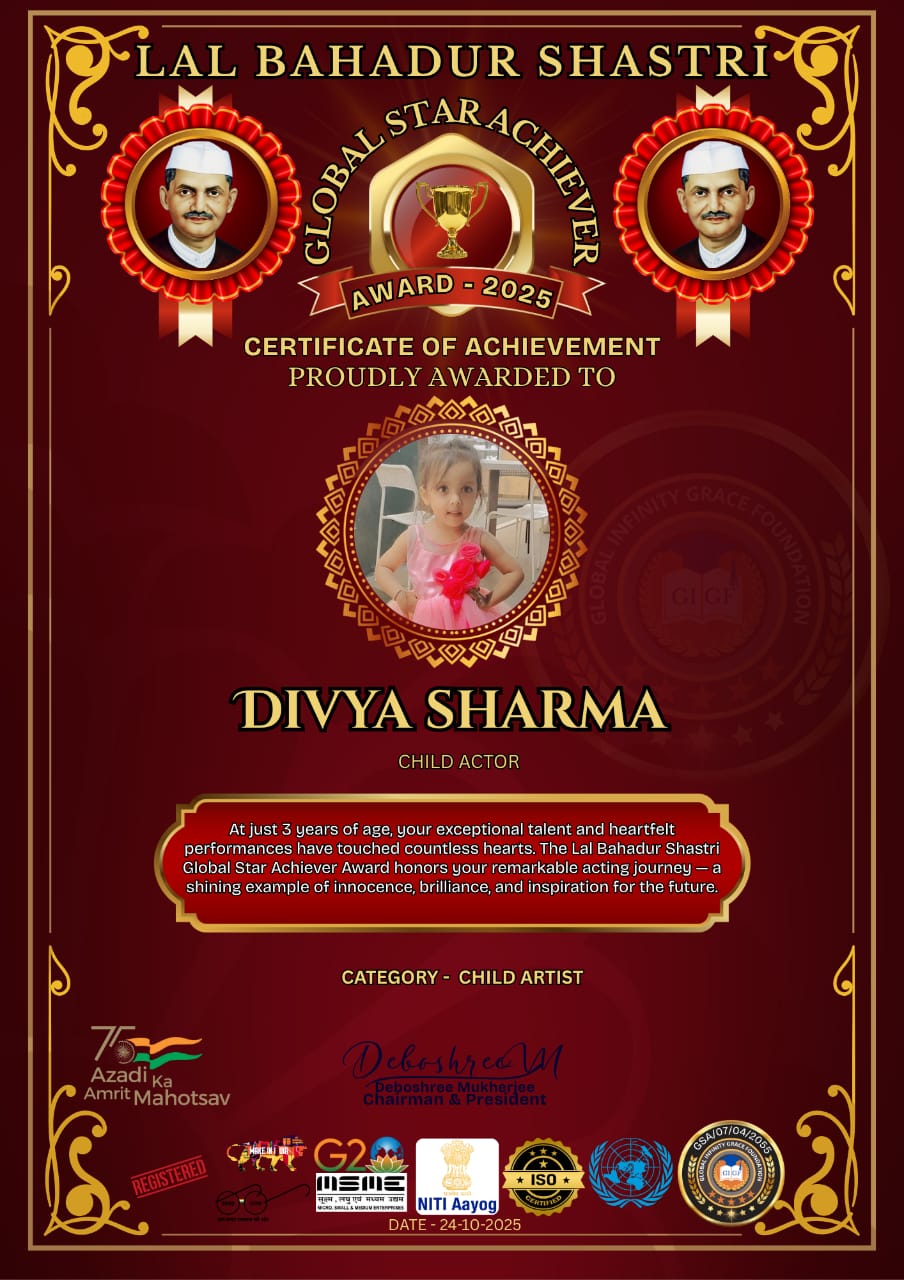 Divia from Tezpur (Assam) is surprising everyone by doing great things at her very young age. At the age of 3 Diviya has earned a lot of fame by working in 2 Assamese films. Apart from working in films Divia also doing modeling. She has recently been awarded The LAL BAHADUR SHASTRI GLOBAL ACHIEVER AWARD 2025.