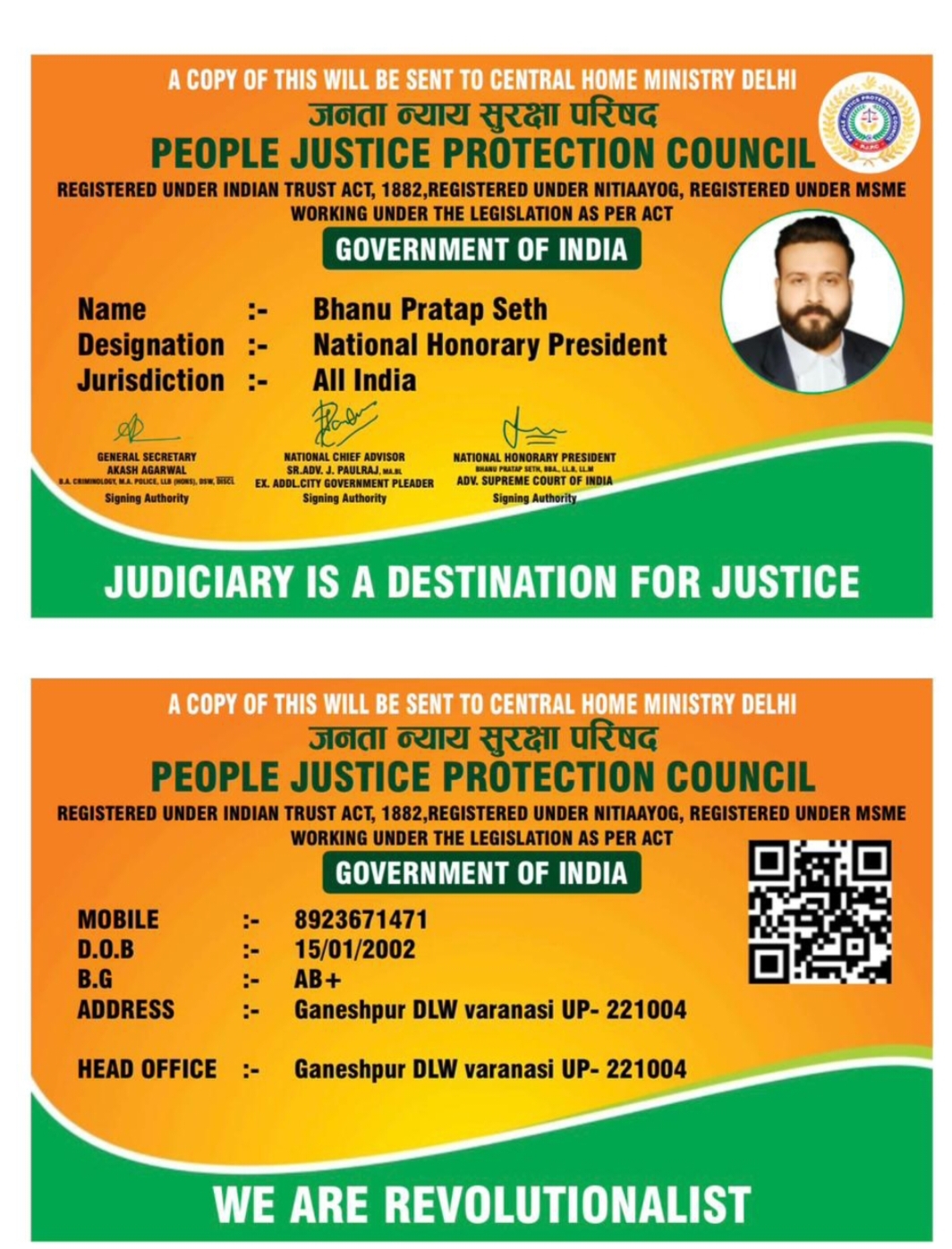 The People Justice Protection Council (PJPC) has announced the appointment of Advocate Bhanu Pratap Seth from Varanasi Uttar Pradesh as its National Honorary President, with jurisdiction extending across All India, as per information released by the organization.