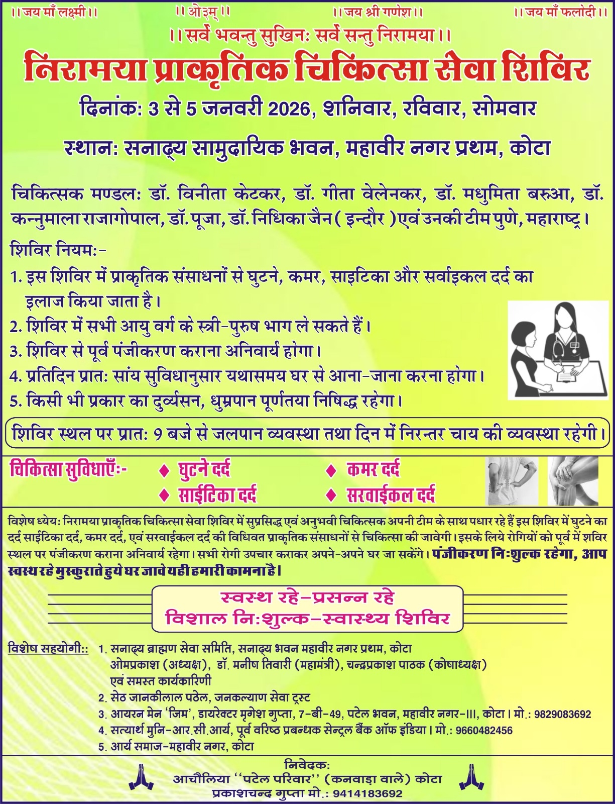 कोटा, 1 जनवरी। तीन दिवसीय निरामया प्राकृतिक चिकित्सा सेवा शिविर 3 से 5 जनवरी तक सनाढ्य भवन महावीर नगर प्रथम में प्रातः 9 बजे से आयोजित किया जाएगा। आयोजक प्रकाशचंद गुप्ता ने बताया कि शिविर में प्राकृतिक संसाधनों के द्वारा घुटने का दर्द, कमर दर्द, साइटिका तथा सर्वाइकल के दर्द का इलाज किया जाएगा। जिसके लिए निशुल्क पंजीकरण किए जा रहे हैं।