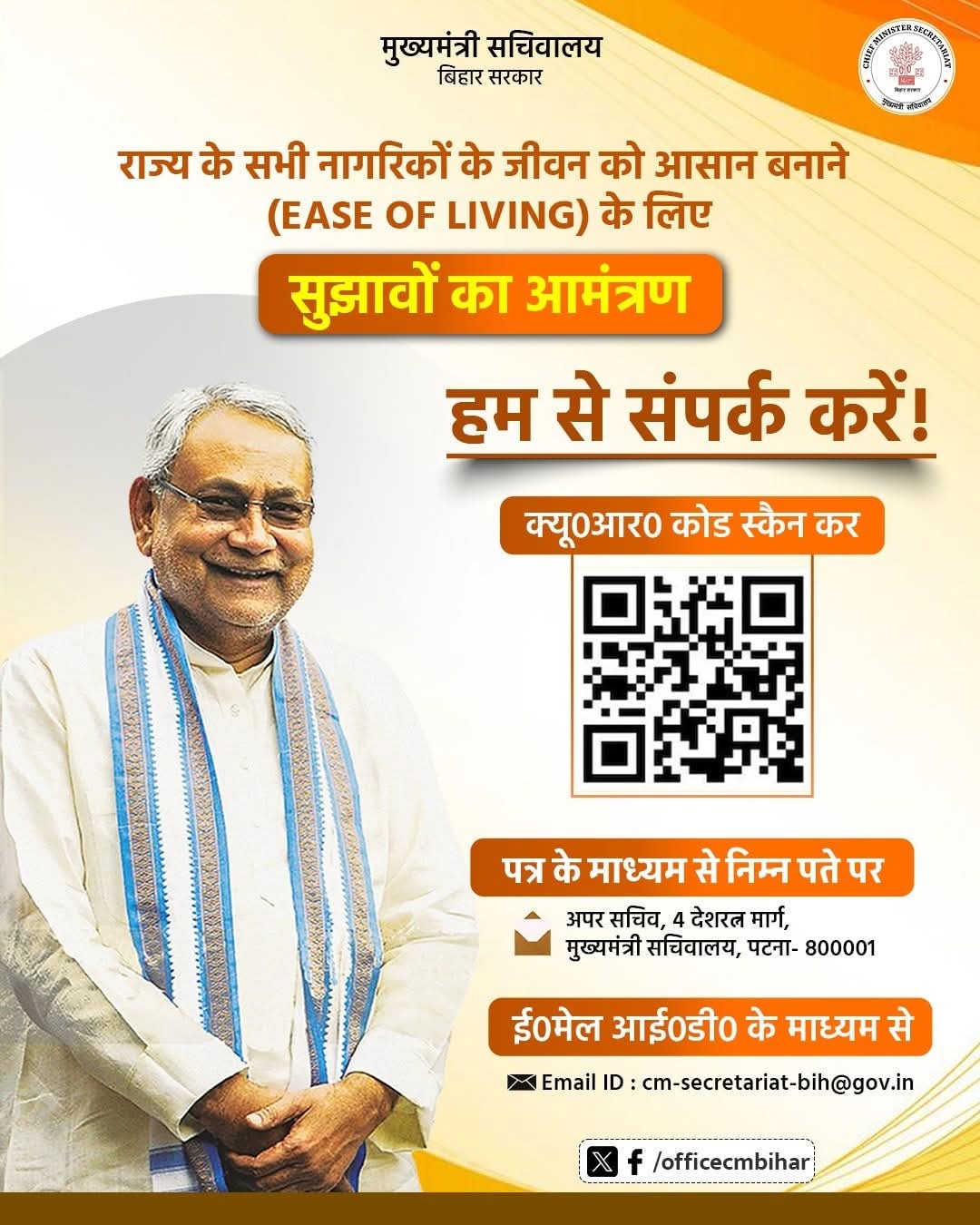 एवं हर क्षेत्र के विकास के लिए काम किया है। हमलोगों ने पूरे बिहार को अपना परिवार माना है और सबके मान और सम्मान का पूरा ख्याल रखा है। अब राज्य में समाज के हर वर्ग के लोग सम्मान के साथ आसानी से जीवन व्यतीत कर सकें इसे लेकर हमलोगों ने गंभीरता से कार्य प्रारंभ कर दिया है।हमलोगों ने वर्ष 2025 से 2030 के लिए राज्य को देश के सर्वाधिक विकसित राज्यों की श्रेणी में शामिल करने हेतु सात निश्चय-3 के कार्यक्रमों को लागू किया है। सात निश्चय-3 के सातवें निश्चय ‘सबका सम्मान-जीवन आसान’ (Ease of Living) का उद्देश्य राज्य के सभी नागरिकों के जीवन में आने वाली कठिनाइयों को कम करना तथा उनके जीवन को और भी आसान बनाना है।सबसे पहले हमलोगों की कोशिश है कि राज्य के जरूरतमंद वरिष्ठ नागरिकों को जरूरत के समय उनके घर पर ही अत्यावश्यक स्वास्थ्य सेवाएं उपलब्ध हो सकें। जैसे...1. नर्सिंग सहायता की सुविधा।2. घर पर ही पैथोलॉजी जांच की सुविधा।3. ब्लड प्रेशर जांच और ई॰सी॰जी॰ जांच की सुविधा।4. फिजियोथेरेपी की सुविधा।5. आपातकालीन स्थिति में सभी प्रकार की चिकित्सकीय सहायता।राज्य के वरिष्ठ नागरिकों को स्वास्थ्य संबंधित उपरोक्त सभी सुविधाएं उन्हें घर पर ही मिल सकें, इसे लेकर हमलोगों ने स्वास्थ्य विभाग को तेजी से काम करने का निर्देश दिया है।राज्य के वरिष्ठ नागरिकों के जीवन को आसान बनाने हेतु और क्या-क्या सुविधाएं दी जा सकती हैं, इसे चिह्नित किया जाना भी आवश्यक है। इस संबंध में अगर आप कोई विशिष्ट सुझाव देना चाहते हैं तो अपने बहुमूल्य सुझाव निम्न में से किसी एक माध्यम से दे सकते हैं।- श्री नीतीश कुमार, माननीय मुख्यमंत्रीNitish Kumar