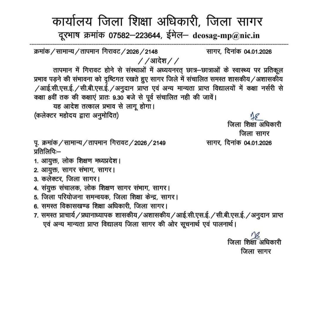 उन्होंने स्पष्ट किया कि यह आदेश केवल नर्सरी से कक्षा आठवीं तक के विद्यार्थियों पर लागू होगा, जबकि अन्य कक्षाओं के संचालन के संबंध में विद्यालय अपने स्तर पर मौसम की स्थिति को देखते हुए आवश्यक सावधानी बरतेंगे। साथ ही विद्यालय प्रबंधन को निर्देश दिए गए हैं कि विद्यार्थियों को ठंड से बचाव के लिए पर्याप्त व्यवस्था सुनिश्चित की जाए, जैसे कि सुबह की प्रार्थना खुले मैदान में न कराई जाए तथा कक्षाओं में बैठने की उचित व्यवस्था हो।