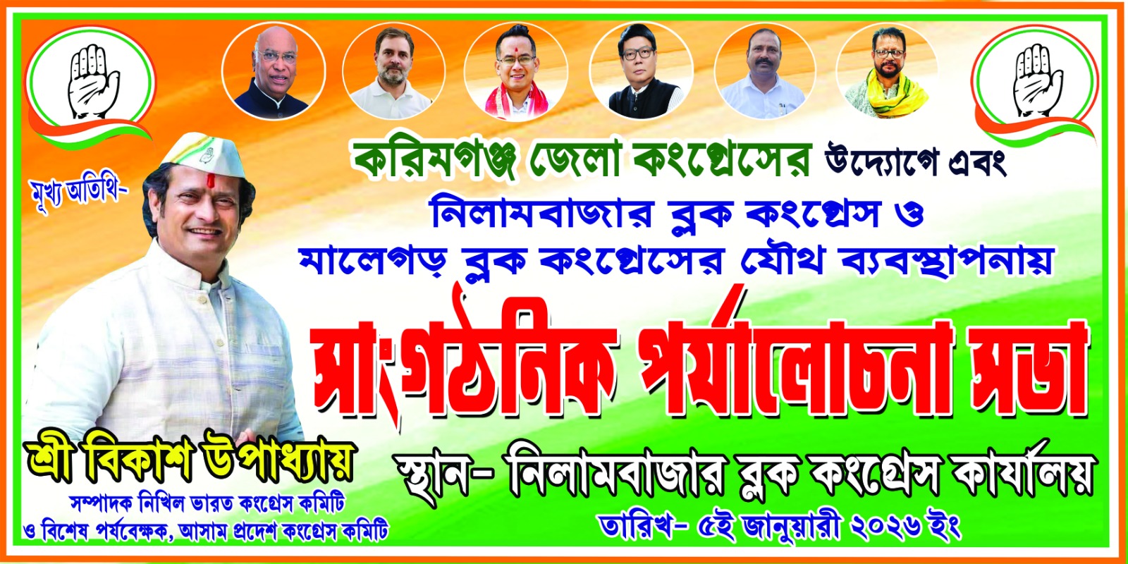 Tomorrow, January 5, 2026, a special organizational review meeting will be held in the South Karimganj constituency of Assam, organized by the Karimganj District Congress Committee and managed by the Nilambazar Block and Malegarh Block Congress Committees. The meeting will be attended by Mr. Vikas Upadhyay, Secretary of the All India Congress Committee and Special Observer for Assam, and Mr. Nasir Khan, General Secretary of the Assam Pradesh Congress Committee and Observer for Karimganj District Congress. Venue: Nilambazar Block Congress Office, Time: 1:00 PM.