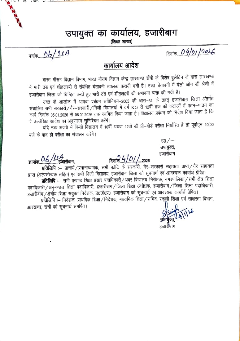 हजारीबाग: झारखंड में कड़ाके की ठंड और बढ़ती शीतलहर को देखते हुए हजारीबाग जिला प्रशासन ने बच्चों की सुरक्षा के लिए एक महत्वपूर्ण निर्णय लिया है। उपायुक्त (DC) कार्यालय द्वारा जारी आधिकारिक आदेश के अनुसार, जिले के सभी स्कूलों में शैक्षणिक गतिविधियाँ अगले दो दिनों के लिए स्थगित कर दी गई हैं।