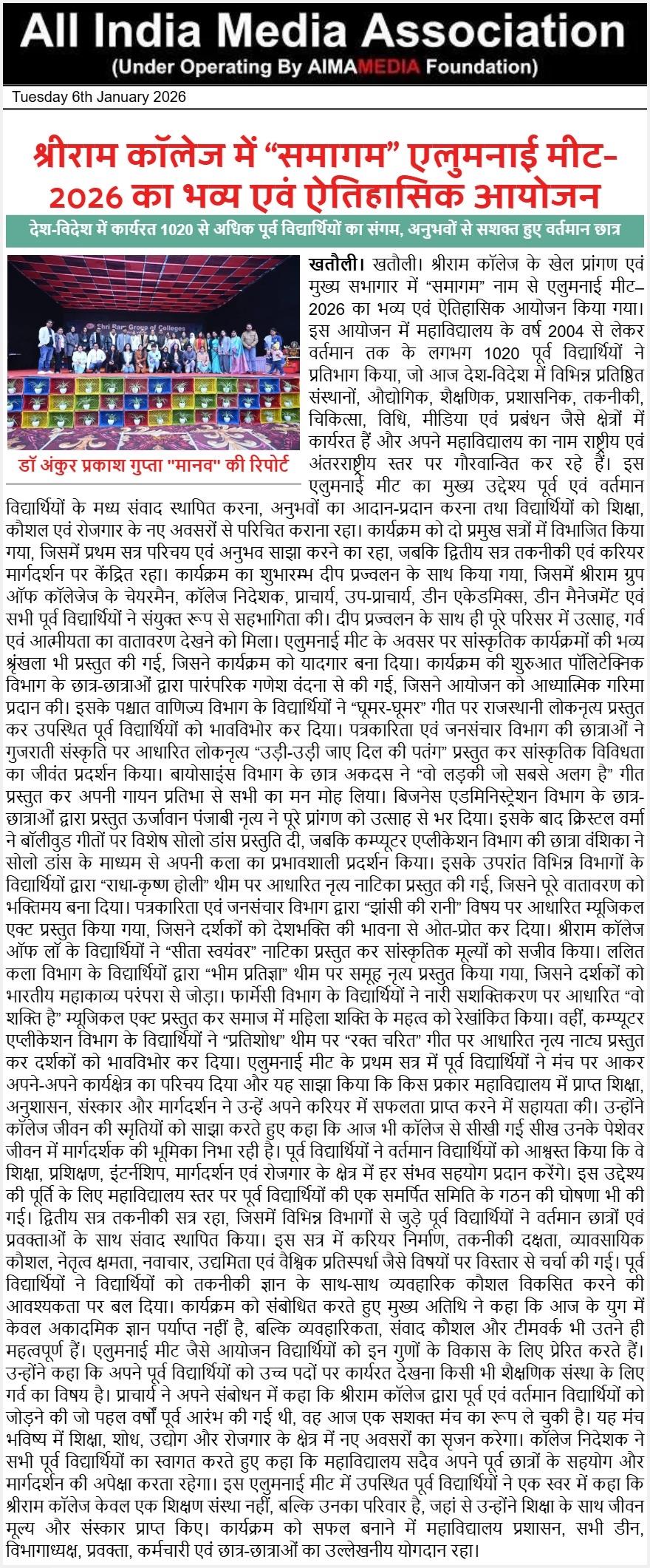 खतौली। श्रीराम कॉलेज के खेल प्रांगण एवं मुख्य सभागार में “समागम” नाम से एलुमनाई मीट–2026 का भव्य एवं ऐतिहासिक आयोजन किया गया। इस आयोजन में महाविद्यालय के वर्ष 2004 से लेकर वर्तमान तक के लगभग 1020 पूर्व विद्यार्थियों ने प्रतिभाग किया, जो आज देश-विदेश में विभिन्न प्रतिष्ठित संस्थानों, औद्योगिक, शैक्षणिक, प्रशासनिक, तकनीकी, चिकित्सा, विधि, मीडिया एवं प्रबंधन जैसे क्षेत्रों में कार्यरत हैं और अपने महाविद्यालय का नाम राष्ट्रीय एवं अंतरराष्ट्रीय स्तर पर गौरवान्वित कर रहे हैं। इस एलुमनाई मीट का मुख्य उद्देश्य पूर्व एवं वर्तमान विद्यार्थियों के मध्य संवाद स्थापित करना, अनुभवों का आदान-प्रदान करना तथा विद्यार्थियों को शिक्षा, कौशल एवं रोजगार के नए अवसरों से परिचित कराना रहा। कार्यक्रम को दो प्रमुख सत्रों में विभाजित किया गया, जिसमें प्रथम सत्र परिचय एवं अनुभव साझा करने का रहा, जबकि द्वितीय सत्र तकनीकी एवं करियर मार्गदर्शन पर केंद्रित रहा। कार्यक्रम का शुभारम्भ दीप प्रज्वलन के साथ किया गया, जिसमें श्रीराम ग्रुप ऑफ कॉलेजेज के चेयरमैन, कॉलेज निदेशक, प्राचार्य, उप-प्राचार्य, डीन एकेडमिक्स, डीन मैनेजमेंट एवं सभी पूर्व विद्यार्थियों ने संयुक्त रूप से सहभागिता की। दीप प्रज्वलन के साथ ही पूरे परिसर में उत्साह, गर्व एवं आत्मीयता का वातावरण देखने को मिला। एलुमनाई मीट के अवसर पर सांस्कृतिक कार्यक्रमों की भव्य श्रृंखला भी प्रस्तुत की गई, जिसने कार्यक्रम को यादगार बना दिया। कार्यक्रम की शुरुआत पॉलिटेक्निक विभाग के छात्र-छात्राओं द्वारा पारंपरिक गणेश वंदना से की गई, जिसने आयोजन को आध्यात्मिक गरिमा प्रदान की। इसके पश्चात वाणिज्य विभाग के विद्यार्थियों ने “घूमर-घूमर” गीत पर राजस्थानी लोकनृत्य प्रस्तुत कर उपस्थित पूर्व विद्यार्थियों को भावविभोर कर दिया। पत्रकारिता एवं जनसंचार विभाग की छात्राओं ने गुजराती संस्कृति पर आधारित लोकनृत्य “उड़ी-उड़ी जाए दिल की पतंग” प्रस्तुत कर सांस्कृतिक विविधता का जीवंत प्रदर्शन किया। बायोसाइंस विभाग के छात्र अकदस ने “वो लड़की जो सबसे अलग है” गीत प्रस्तुत कर अपनी गायन प्रतिभा से सभी का मन मोह लिया। बिजनेस एडमिनिस्ट्रेशन विभाग के छात्र-छात्राओं द्वारा प्रस्तुत ऊर्जावान पंजाबी नृत्य ने पूरे प्रांगण को उत्साह से भर दिया। इसके बाद क्रिस्टल वर्मा ने बॉलीवुड गीतों पर विशेष सोलो डांस प्रस्तुति दी, जबकि कम्प्यूटर एप्लीकेशन विभाग की छात्रा वंशिका ने सोलो डांस के माध्यम से अपनी कला का प्रभावशाली प्रदर्शन किया। इसके उपरांत विभिन्न विभागों के विद्यार्थियों द्वारा “राधा-कृष्ण होली” थीम पर आधारित नृत्य नाटिका प्रस्तुत की गई, जिसने पूरे वातावरण को 