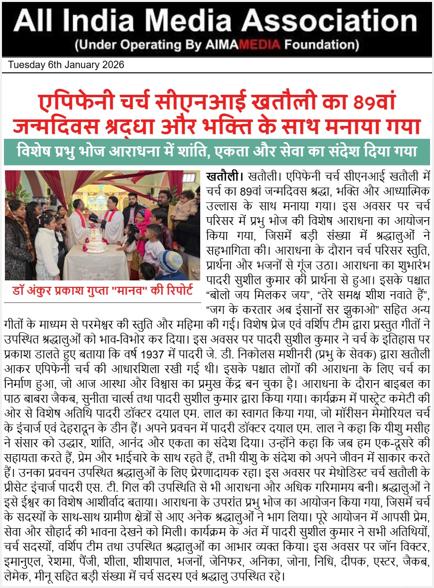 खतौली। एपिफेनी चर्च सीएनआई खतौली में चर्च का 89वां जन्मदिवस श्रद्धा, भक्ति और आध्यात्मिक उल्लास के साथ मनाया गया। इस अवसर पर चर्च परिसर में प्रभु भोज की विशेष आराधना का आयोजन किया गया, जिसमें बड़ी संख्या में श्रद्धालुओं ने सहभागिता की। आराधना के दौरान चर्च परिसर स्तुति, प्रार्थना और भजनों से गूंज उठा। आराधना का शुभारंभ पादरी सुशील कुमार की प्रार्थना से हुआ। इसके पश्चात “बोलो जय मिलकर जय”, “तेरे समक्ष शीश नवाते हैं”, “जग के करतार अब इंसानों सर झुकाओ” सहित अन्य गीतों के माध्यम से परमेश्वर की स्तुति और महिमा की गई। विशेष प्रेज एवं वर्शिप टीम द्वारा प्रस्तुत गीतों ने उपस्थित श्रद्धालुओं को भाव-विभोर कर दिया। इस अवसर पर पादरी सुशील कुमार ने चर्च के इतिहास पर प्रकाश डालते हुए बताया कि वर्ष 1937 में पादरी जे. डी. निकोलस मशीनरी (प्रभु के सेवक) द्वारा खतौली आकर एपिफेनी चर्च की आधारशिला रखी गई थी। इसके पश्चात लोगों की आराधना के लिए चर्च का निर्माण हुआ, जो आज आस्था और विश्वास का प्रमुख केंद्र बन चुका है। आराधना के दौरान बाइबल का पाठ बाबरा जैकब, सुनीता चार्ल्स तथा पादरी सुशील कुमार द्वारा किया गया। कार्यक्रम में पास्ट्रेट कमेटी की ओर से विशेष अतिथि पादरी डॉक्टर दयाल एम. लाल का स्वागत किया गया, जो मॉरीसन मेमोरियल चर्च के इंचार्ज एवं देहरादून के डीन हैं। अपने प्रवचन में पादरी डॉक्टर दयाल एम. लाल ने कहा कि यीशु मसीह ने संसार को उद्धार, शांति, आनंद और एकता का संदेश दिया। उन्होंने कहा कि जब हम एक-दूसरे की सहायता करते हैं, प्रेम और भाईचारे के साथ रहते हैं, तभी यीशु के संदेश को अपने जीवन में साकार करते हैं। उनका प्रवचन उपस्थित श्रद्धालुओं के लिए प्रेरणादायक रहा। इस अवसर पर मेथोडिस्ट चर्च खतौली के प्रीसेट इंचार्ज पादरी एस. टी. गिल की उपस्थिति से भी आराधना और अधिक गरिमामय बनी। श्रद्धालुओं ने इसे ईश्वर का विशेष आशीर्वाद बताया। आराधना के उपरांत प्रभु भोज का आयोजन किया गया, जिसमें चर्च के सदस्यों के साथ-साथ ग्रामीण क्षेत्रों से आए अनेक श्रद्धालुओं ने भाग लिया। पूरे आयोजन में आपसी प्रेम, सेवा और सौहार्द की भावना देखने को मिली। कार्यक्रम के अंत में पादरी सुशील कुमार ने सभी अतिथियों, चर्च सदस्यों, वर्शिप टीम तथा उपस्थित श्रद्धालुओं का आभार व्यक्त किया। इस अवसर पर जॉन विक्टर, इमानुएल, रेशमा, पैंजी, शीला, शीशपाल, भजनों, जेनिफर, अनिका, जोना, निधि, दीपक, एस्टर, जैकब, लेमेक, मीनू सहित बड़ी संख्या में चर्च सदस्य एवं श्रद्धालु उपस्थित रहे।