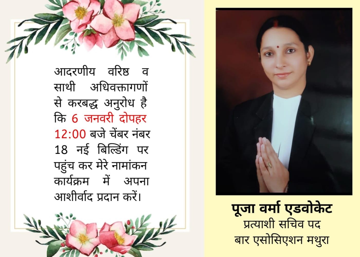 मथुरा बार एसोसिएशन सचिव पद के लिए पूजा वर्मा एडवोकेट ने किया नामांकन, अधिवक्ताओं के साथ निकाला जुलूस