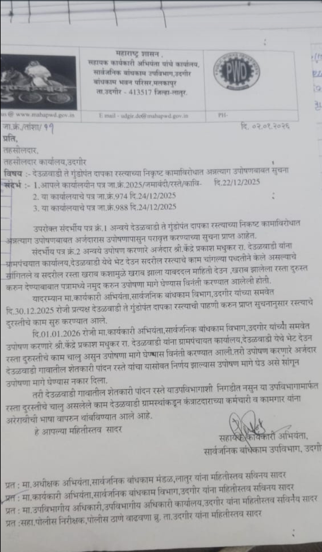 उदगीर तालुक्यातील देउळवाडी ते गुंडोपंत दापका रस्त्याच्या निकृष्ट व सदोष कामाविरोधात सुरू असलेल्या शांततामय अन्नत्याग उपोषणाला वेगळे वळण देण्याचा प्रकार समोर आला आहे. सार्वजनिक बांधकाम उपविभाग, उदगीर येथील सहायक कार्यकारी अभियंता यांनी दिनांक 02 जानेवारी 2026 रोजी निर्गमित केलेल्या एका अधिकृत पत्रामुळे वाद निर्माण झाला असून, या पत्रात उपोषणकर्ते केंद्रे प्रकाश मधुकर यांनी उपोषण माघार घेण्याच्या प्रक्रियेत असल्याचा आभास निर्माण करण्यात आला आहे.