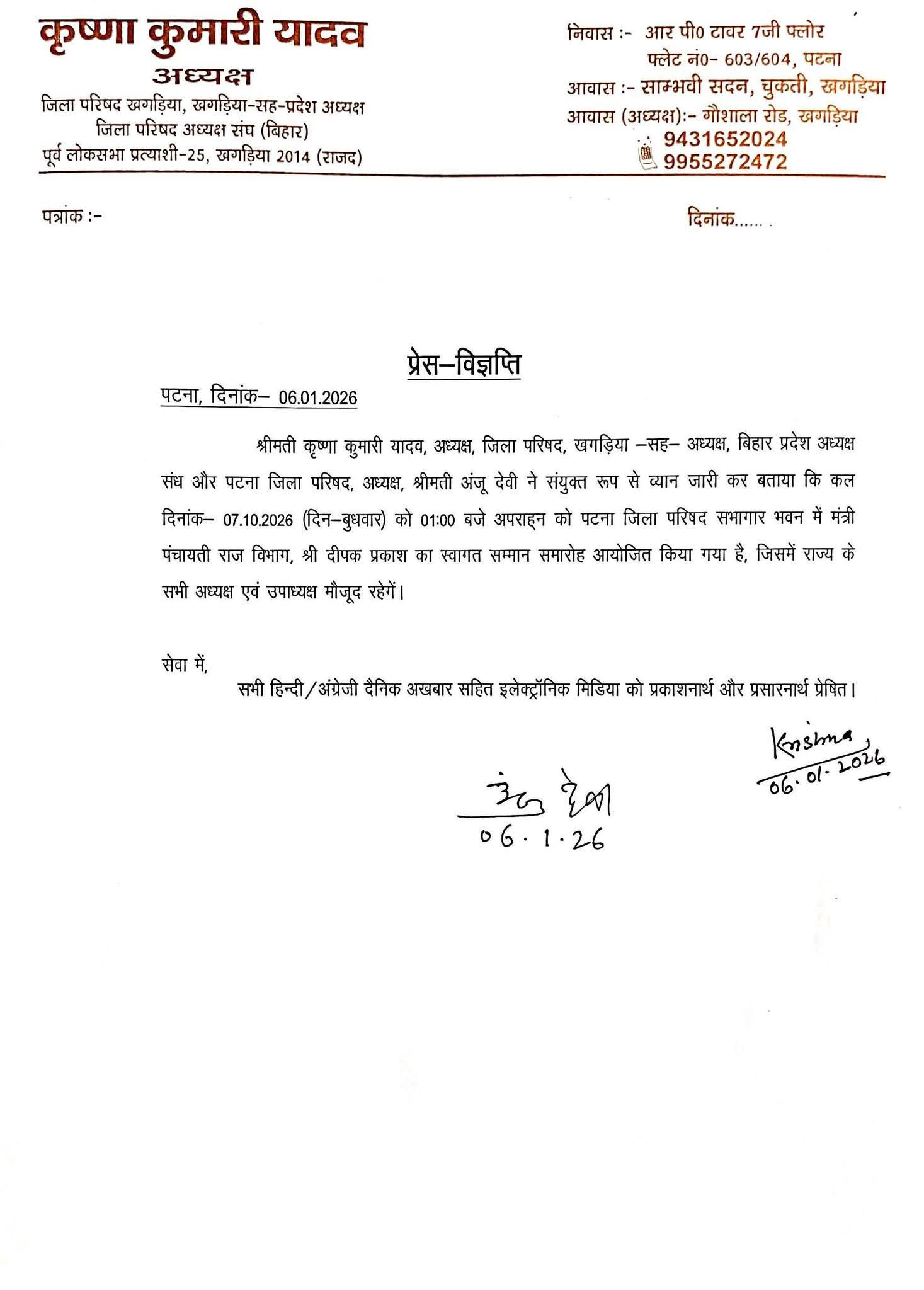 श्रीमती कृष्णा कुमारी यादव , अध्यक्ष, जिला परिषद, खगड़िया-सह-अध्यक्ष, बिहार प्रदेश अध्यक्ष संघ और पटना जिला परिषद अध्यक्ष, श्रीमती अंजु देवी ने संयुक्त रूप से बयान जारी कर बताया कि कल दिनांक- 07.01.2026 (दिन-बुधवार) को 01:00 बजे अपराह्न को पटना जिला परिषद सभागार भवन में मंत्री पंचायती राज विभाग, श्री दीपक प्रकाश का स्वागत सम्मान समारोह आयोजित किया गया है, जिसमें राज्य के सभी अध्यक्ष एवं उपाध्यक्ष मौजूद रहेंगे।