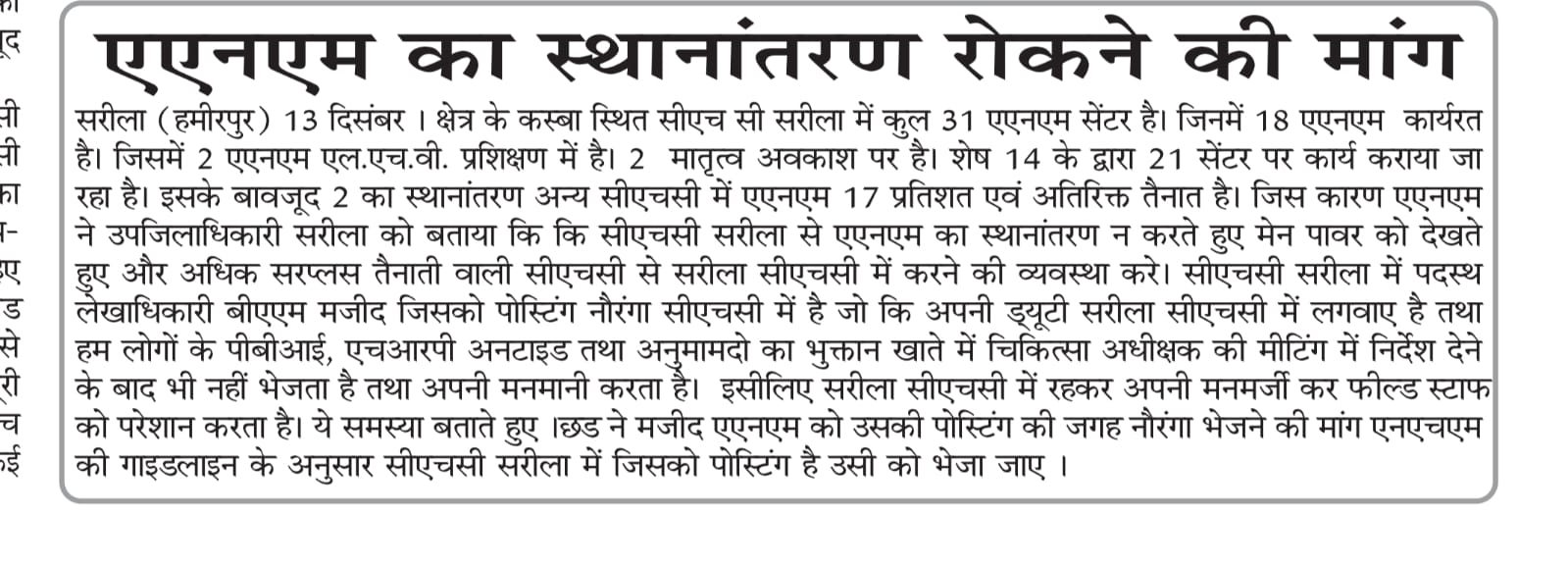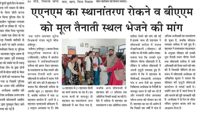 जमीनी स्तर पर कोई कार्यवाही या उचित समाधान ना होने पर परेशान संबिदा कर्मियों का ट्रांसफर किया जा रहा घटना हमीरपुर जिले के सारीला ब्लॉक की जहाँ ये सब अधिकारीयों की मिली भगत से हो रहा है