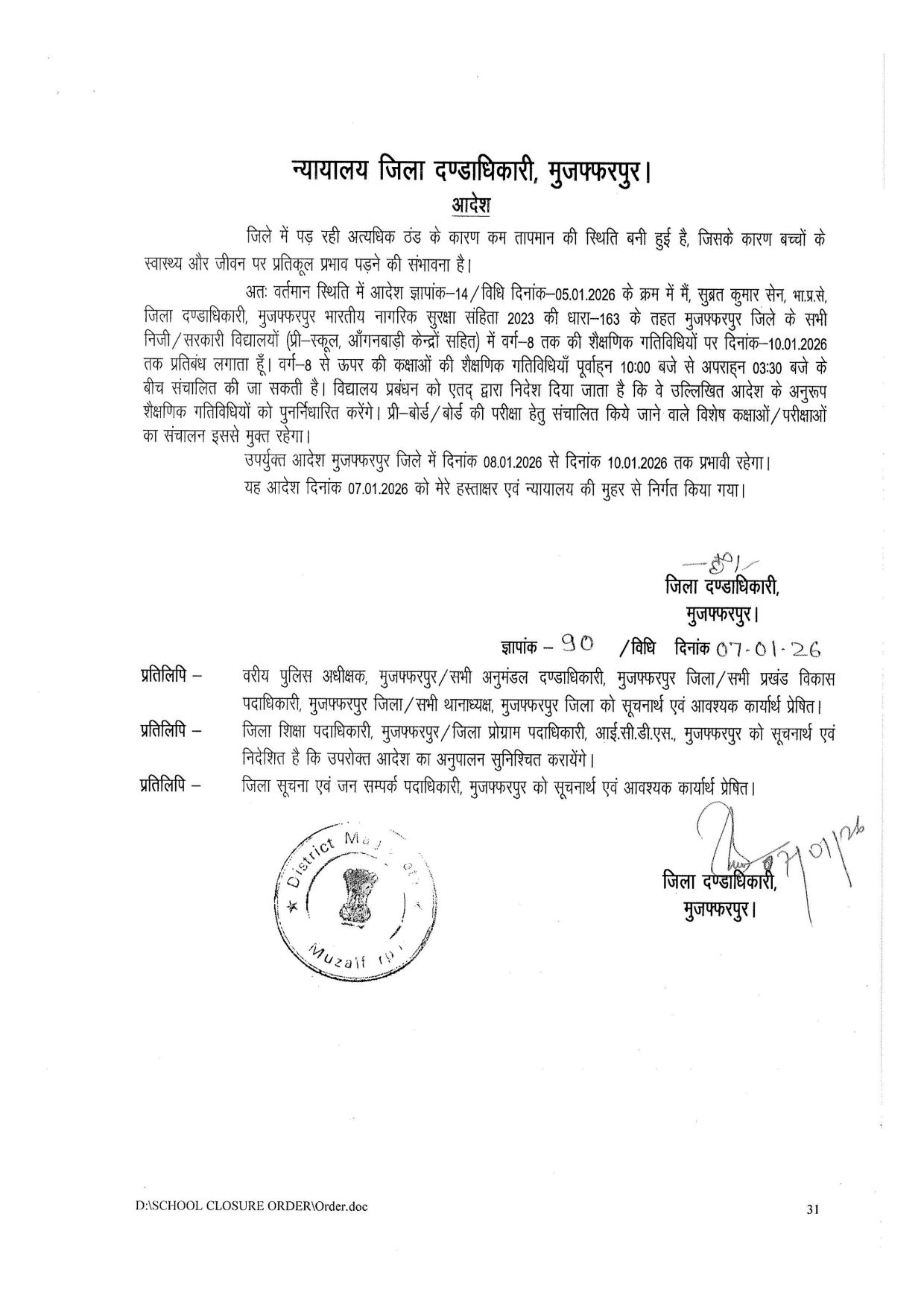 #рдореБрдЬрдлреНрдлрд░рдкреБрд░ред рдЬрд┐рд▓реЗ рдореЗрдВ рд▓рдЧрд╛рддрд╛рд░ рдкрдбрд╝ рд░рд╣реА рдХрдбрд╝рд╛рдХреЗ рдХреА рдардВрдб рдФрд░ рдиреНрдпреВрдирддрдо рддрд╛рдкрдорд╛рди рдореЗрдВ рднрд╛рд░реА рдЧрд┐рд░рд╛рд╡рдЯ рдХреЛ рджреЗрдЦрддреЗ рд╣реБрдП рдЬрд┐рд▓рд╛ рдкреНрд░рд╢рд╛рд╕рди рдиреЗ рдмрдбрд╝рд╛ рдлреИрд╕рд▓рд╛ рд▓рд┐рдпрд╛ рд╣реИред рдмрдЪреНрдЪреЛрдВ рдХреЗ рд╕реНрд╡рд╛рд╕реНрдереНрдп рдФрд░ рдЬреАрд╡рди рдкрд░ рдкрдбрд╝рдиреЗ рд╡рд╛рд▓реЗ рдкреНрд░рддрд┐рдХреВрд▓ рдкреНрд░рднрд╛рд╡ рдХреА рдЖрд╢рдВрдХрд╛ рдХреЛ рдзреНрдпрд╛рди рдореЗрдВ рд░рдЦрддреЗ рд╣реБрдП рдЬрд┐рд▓рд╛ рджрдВрдбрд╛рдзрд┐рдХрд╛рд░реА, рдореБрдЬрдлреНрдлрд░рдкреБрд░ рджреНрд╡рд╛рд░рд╛ рдХрдХреНрд╖рд╛ 8 рддрдХ рдХреЗ рд╕рднреА рд╕рд░рдХрд╛рд░реА рдПрд╡рдВ рдирд┐рдЬреА рд╡рд┐рджреНрдпрд╛рд▓рдпреЛрдВ рдХреА рд╢реИрдХреНрд╖рдгрд┐рдХ рдЧрддрд┐рд╡рд┐рдзрд┐рдпреЛрдВ рдкрд░ рдЕрд╕реНрдерд╛рдпреА рд░реЛрдХ рд▓рдЧрд╛ рджреА рдЧрдИ рд╣реИред