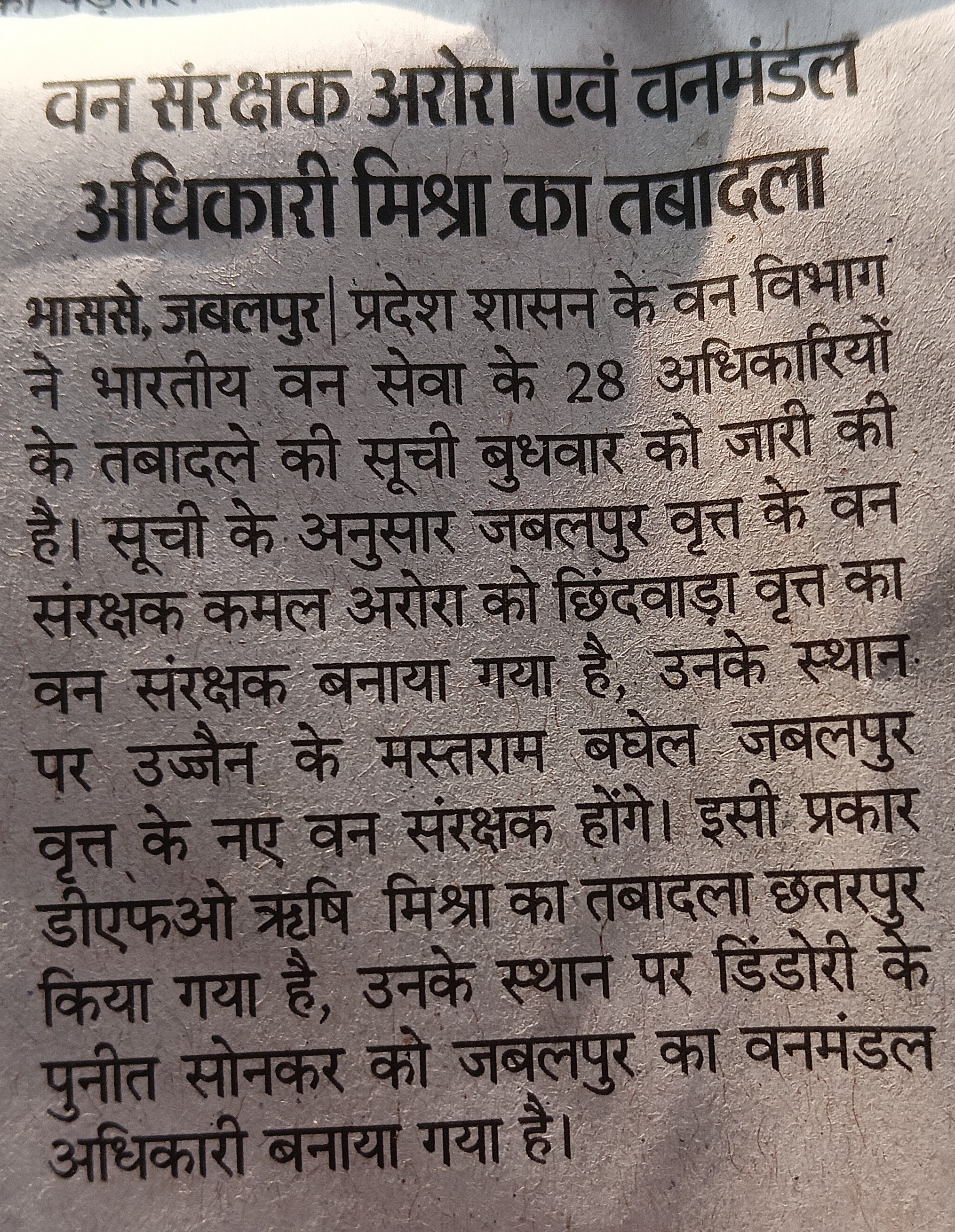 वन संरक्षण अरोरा एवं वन मंडल अधिकारी मिश्रा का तबादला