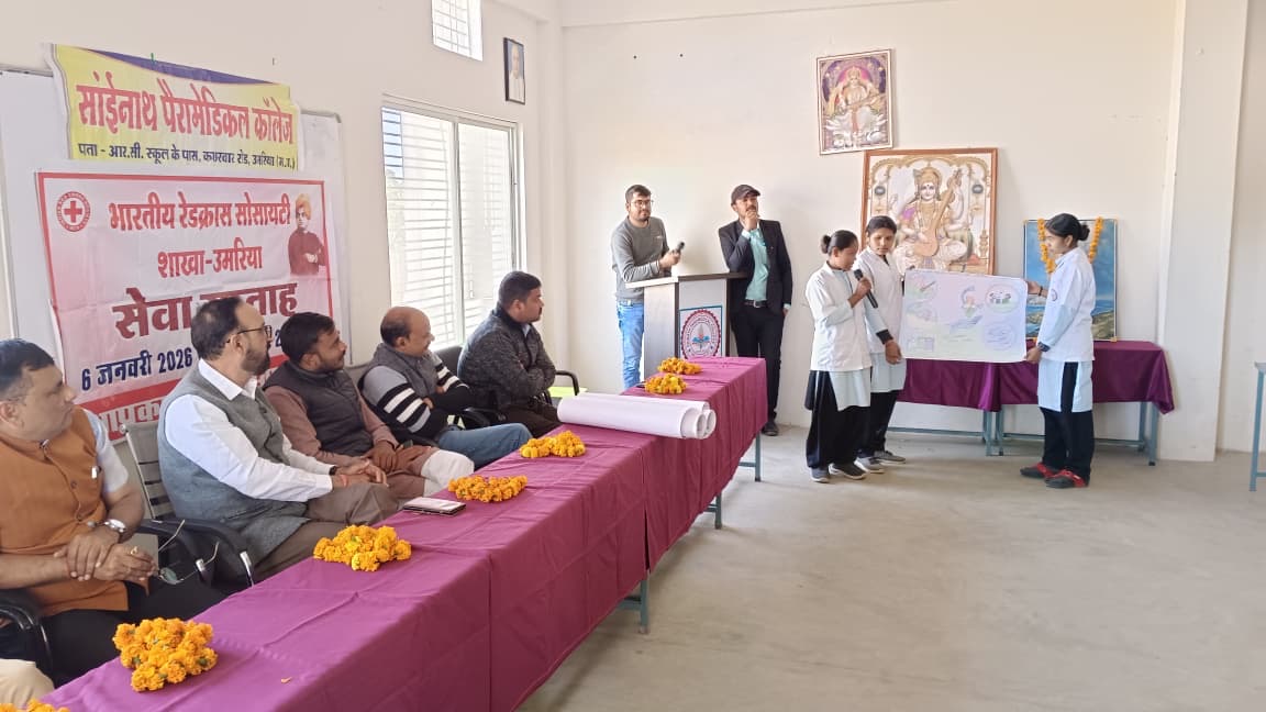 स्वामी विवेकानंद जयंती एवं “राष्ट्रीय युवा दिवस” के अवसर पर भारतीय रेड क्रॉस सोसायटी, जिला शाखा उमरिया द्वारा 6 से 12 जनवरी 2026 तक जिले भर में “सेवा सप्ताह” मनाया जा रहा है। यह आयोजन भारतीय *रेड क्रॉस सोसायटी मध्यप्रदेश राज्य शाखा, भोपाल के निर्देशानुसार तथा रेड क्रॉस सोसायटी शाखा उमरिया के अध्यक्ष श्री धरणेन्द्र कुमार जैन (कलेक्टर, उमरिया) के मार्गदर्शन* में आयोजित किया जा रहा है। इसी क्रम में दिनांक *08 जनवरी 2026 को साईं नाथ पैरामेडिकल कॉलेज, उमरिया* में *“स्वच्छ राष्ट्र–स्वस्थ समाज अभियान” के अंतर्गत स्वच्छता जागरूकता कार्यक्रम, स्वच्छता संदेश, पोस्टर एवं जन-जागरूकता गतिविधियों* का आयोजन किया गया।