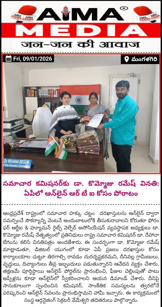 ఆంధ్రప్రదేశ్ రాష్ట్రంలో ఇప్పటికీ ఆన్‌లైన్ RTI (సమాచార హక్కు) సేవలు లేవు అనే విషయం ప్రజలకు తీవ్ర ఇబ్బందిగా మారిందని పేర్కొంటూ,ఫోరం ఫర్ ఆర్టీఐ & హ్యూమన్ రైట్స్ వెల్ఫేర్ అసోసియేషన్ వ్యవస్థాపక అధ్యక్షులు డా. కొమ్మోజు రమేష్ మరియు సంస్థ ఆర్గనైజింగ్ సెక్రటరీ వేమేశ్వరి పాల్గొన్నారు. ఈరోజు తేది: 08-1-2026 న విజయవాడలోని రాష్ట్ర సమాచార కమిషనర్ డా. రేహానా బేగం గారిని మర్యాదపూర్వకంగా కలిసి