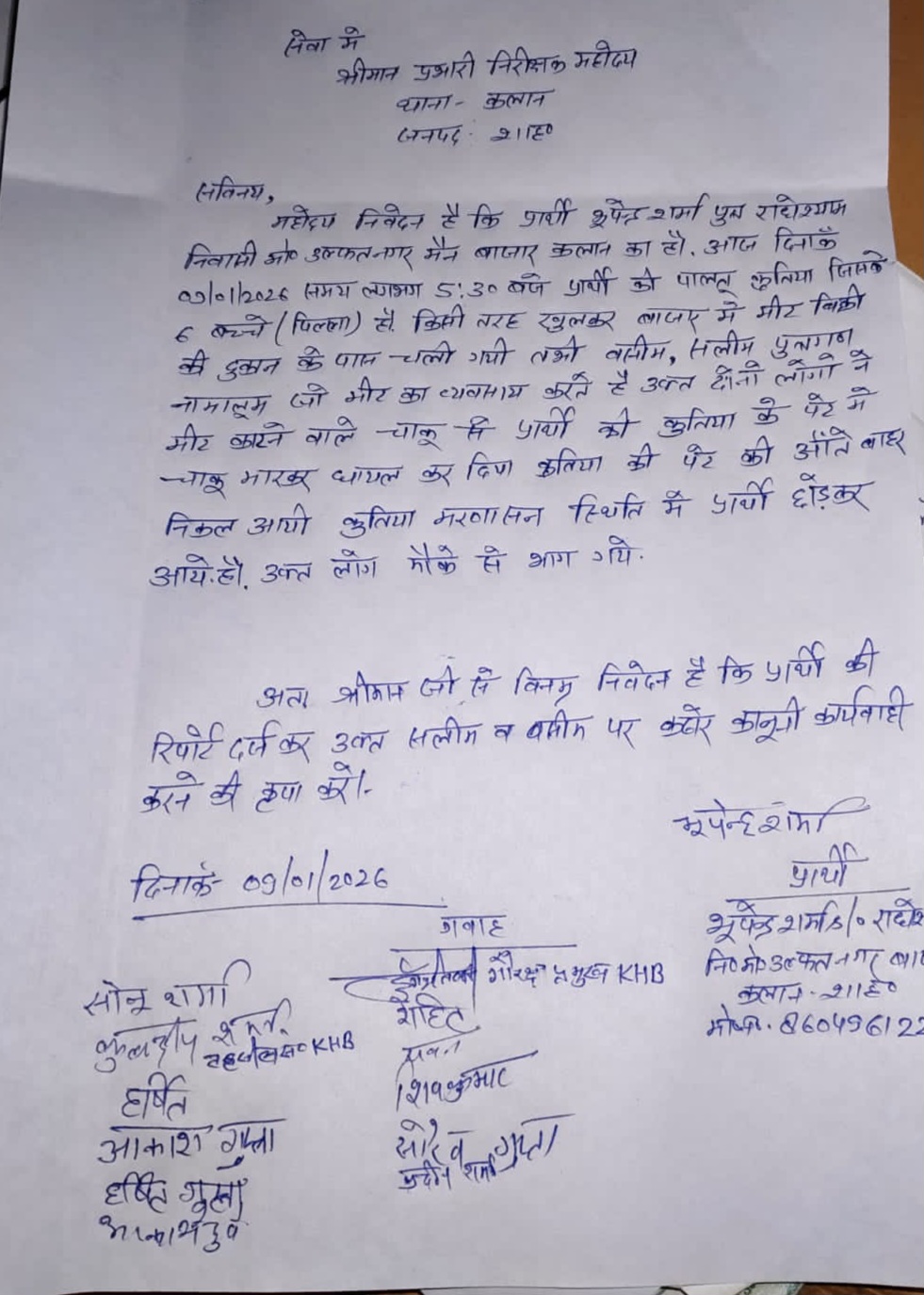 गौरक्षा प्रमुख केसरिया हिन्दू वाहिनी दुर्गेश तिवारी ने बताय की हमारे साथियों को जब पता चला कि पालतू कुतिया को बसीम व सलीम द्वारा कुतिया को चाकू मार कर निर्मम हत्या कर के पुराना बाजार के तलाब के पास फेंक दिया है। जिस को मेरे द्वारा संज्ञान लिया गया। और मेरे द्वारा थानाध्यक्ष कलान को लिखित रूप मे शिकायत दर्ज करवाई गई है।