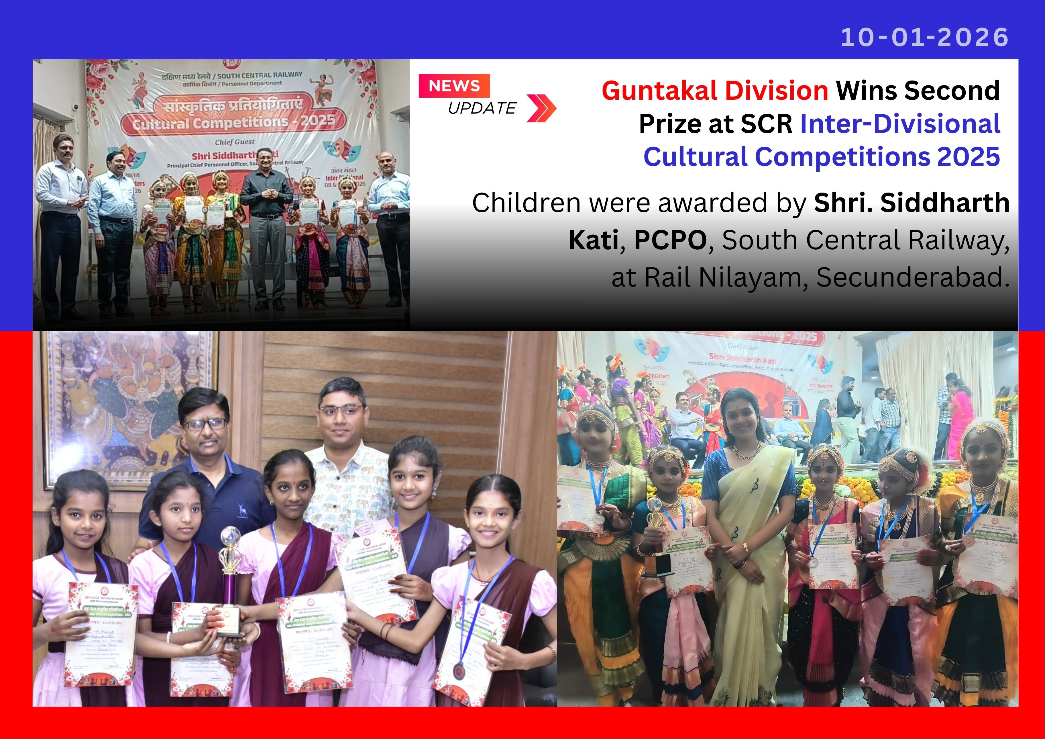 Guntakal Division Secures Second Prize at South Central Railway Inter-Divisional Cultural Competitions 2025 The Guntakal Division achieved a notable success by securing the Second Prize in Classical Group Dance at the South Central Railway Inter-Divisional Cultural Competitions 2025, held on 8th and 9th January 2026 at Rail Nilayam, Secunderabad. Representing Guntakal Division, the talented students of Shri Lalitha Natyalaya, Mandy Bazaar, Guntakal, delivered a graceful and disciplined Bharatanatyam performance that was highly appreciated by the judges and audience alike. The achievement stands as a testimony to the students’ dedication, cultural discipline and artistic excellence. The award ceremony was held at the DRM Office, Guntakal, where the winning students were felicitated with medals and certificates by Shri Chandra S. Gupta, Divisional Railway Manager (DRM), Guntakal. During the ceremony, the DRM Sir congratulated the students for their remarkable performance and encouraged them to continue preserving and promoting India’s rich classical dance heritage. Speaking on the occasion, Ms. Lakshmi Durga expressed her pride in the students and stated that this recognition at an inter-divisional level is a motivating milestone for both the students and the institution. The felicitation ceremony was attended by students, parents, and well-wishers, marking a proud moment for Shri Lalitha Natyalaya, Guntakal Division, and the local cultural community. The participating students were K. Chinmayi from Railway School, K. Kaavya from Montessori School, Pobatti Hayathi & B. Vennela from Vignan School, and C. Varnika from Kendriya Vidyalaya (K V School).