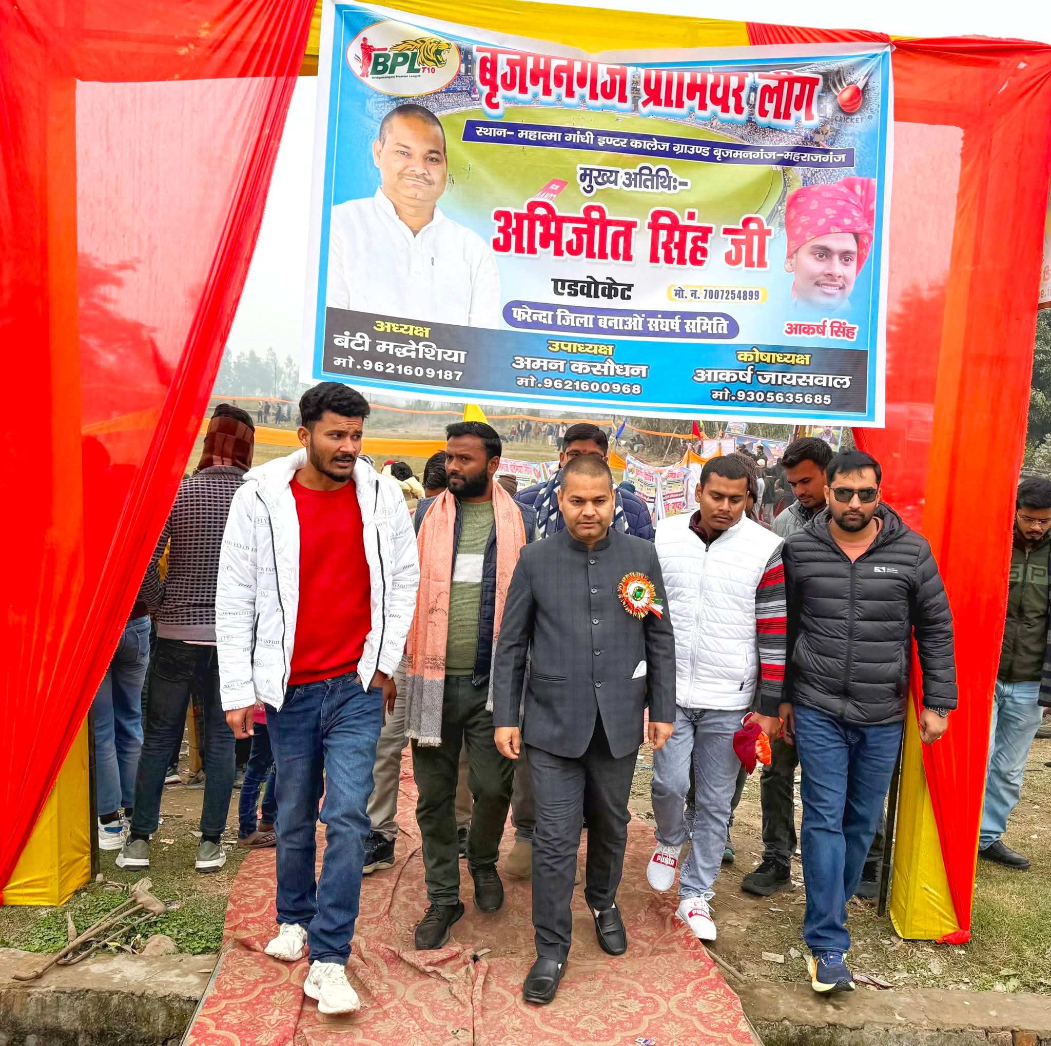 महात्मा गांधी इंटर कॉलेज खेल मैदान में खेले जा रहे बीपीएल कैनवस बाल क्रिकेट प्रतियोगिता के छठे दिन मुख्य अतिथि महराजगंज के मशहूर क्राइम एडवोकेट व फरेंदा जिला बनाओ संघर्ष समिति अध्यक्ष अभिजीत सिंह का किया गया जोरदार स्वागत।मैच अध्यक्ष अभिलाष जायसवाल ने मुख्य अतिथि को माला पहनकर व बैच लगाकर उनका अभिवादन किया।