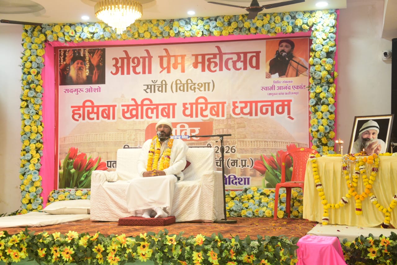ओशो प्रेम महोत्सव श्री तारा रिजॉर्ट सांची विदिशा में हसिबा,खेलिबा,धरिबा ध्यान शिविर का स्वामी आनन्द एकांत जी के सानिध्य में विदिशा ओशो प्रेमियों के द्वारा दिनांक 8 जनवरी दिन गुरुवार सायंकाल 6:30 भव्य शुभारंभ हुआ।शिविर का समापन 11 जनवरी को दीक्षा समारोह के साथ समापन होगा।लायंस इंटरनेशनल मल्टीमीडिया प्रभारी एवं पूर्व अध्यक्ष लायन अरुण कुमार सोनी ने बताया कि शुभारंभ के अवसर पर ध्यान शिविर संचालक मधुबन चांपा छत्तीसगढ़ से पधारे स्वामी आनंद एकांत,मां मुस्कान,राष्ट्रीय मीडिया प्रभारी अखिल भारतीय स्वर्णकार महासभा लायन अरुण कुमार सोनी,सहित वरिष्ठ ओशो प्रेमियों ने दीप प्रज्वलन किया।इसके पश्चात शिविर संचालक स्वामी जी का तिलक,चन्दन लगा,श्रीफल एवं फूल माला से सभी लोगों ने स्वागत,वदंन,अभिनंदन किया। इसके पश्चात स्वामी जी ने सभी को शिविर संचालन संबंधी जानकारी प्रदान करते हुए विभिन्न ध्यान के कार्यक्रम संपन्न किए।दूसरे ओर तीसरे दिन शुक्रवार,शनिवार दिनांक 9 ओर 10 जनवरी 2026 को निम्नानुसार कार्यक्रम आयोजित हुए। प्रातः - 6.00 से 6.30 - चाय,प्रातः - 6.30 से 7.15 - योगा,प्रातः - 7.30 से 8.30 - साक्रिय ध्यान (पहला सत्र) संपन्न हुआ। इसके बाद प्रातः - 8.30 से 9.30 - नाश्ता,प्रातः - 10.00 से 11.30 - द्वितीय सत्र संपन्न हुआ। दोपहरः - 12.00 से 1.30 - तृतीय सत्र संपन्न हुआ। दोपहरः - 1.30 से 3.00 - भोजन, दोपहरः - 3.00 से 3.45 - चतुर्थ सत्र संपन्न हुआ। शामः - 4.00 से 4.25 - हाई-टी / स्नेक्स, शामः - 4.30 से 5.30 - छठा सत्र संपन्न हुआ। रात्रिः - 6.30 से 8.00 - सातवा सत्र संपन्न हुआ। रात्रिः - 8.00 से 9.00 -भोजन,रात्रिः - 9.00 से 10.00 -सांस्कृतिक कार्यक्रम जोरवा नाईट्स सहित सभी ध्यान कार्यक्रम का समापन हुआ।शनिवार को भी विधिवत ध्यान के विभिन कार्यक्रम हुए सत्र का समापन केंडिल गीत से हुआ इसके पहले सोनी एण्ड म्यूजिक पार्टी ने भजन भी प्रस्तुत किये।रविवार को होगा ओशो प्रेम महोत्सव का समापन।शिविर में भारत के कई राज्यों से ओशो प्रेमी सामिल हुए,छबड़ा,बारां राजस्थान से पदारें स्वामी ध्यान गगन,स्वामी ध्यान साक्षी,योगिराज जे.सी.शर्मा,स्वामी ध्यान यात्री आदि ने भाग लिया और अच्छे आयोजन के लिए विदिशा के ओशो प्रेमियों का आभार जताया।संचालकों नें कार्यक्रम का अधिकतम लाभ उठाने के लिए लोगों को निम्न बातों का ध्यान रखने का आवाहन किया गया। ध्यान कक्ष में समय से 5 मिनट पूर्व पहुंचे, मोबाइल स्विच ऑफ रखे। सारे सत्र में आपकी उपस्थित अनिवार्य है और ध्यान कक्ष में किसी भी प्रकार की बात चीत न करें। एक बार ध्यान शुरु होने के बाद आपके प्रवेश का निषेध रहेगा।