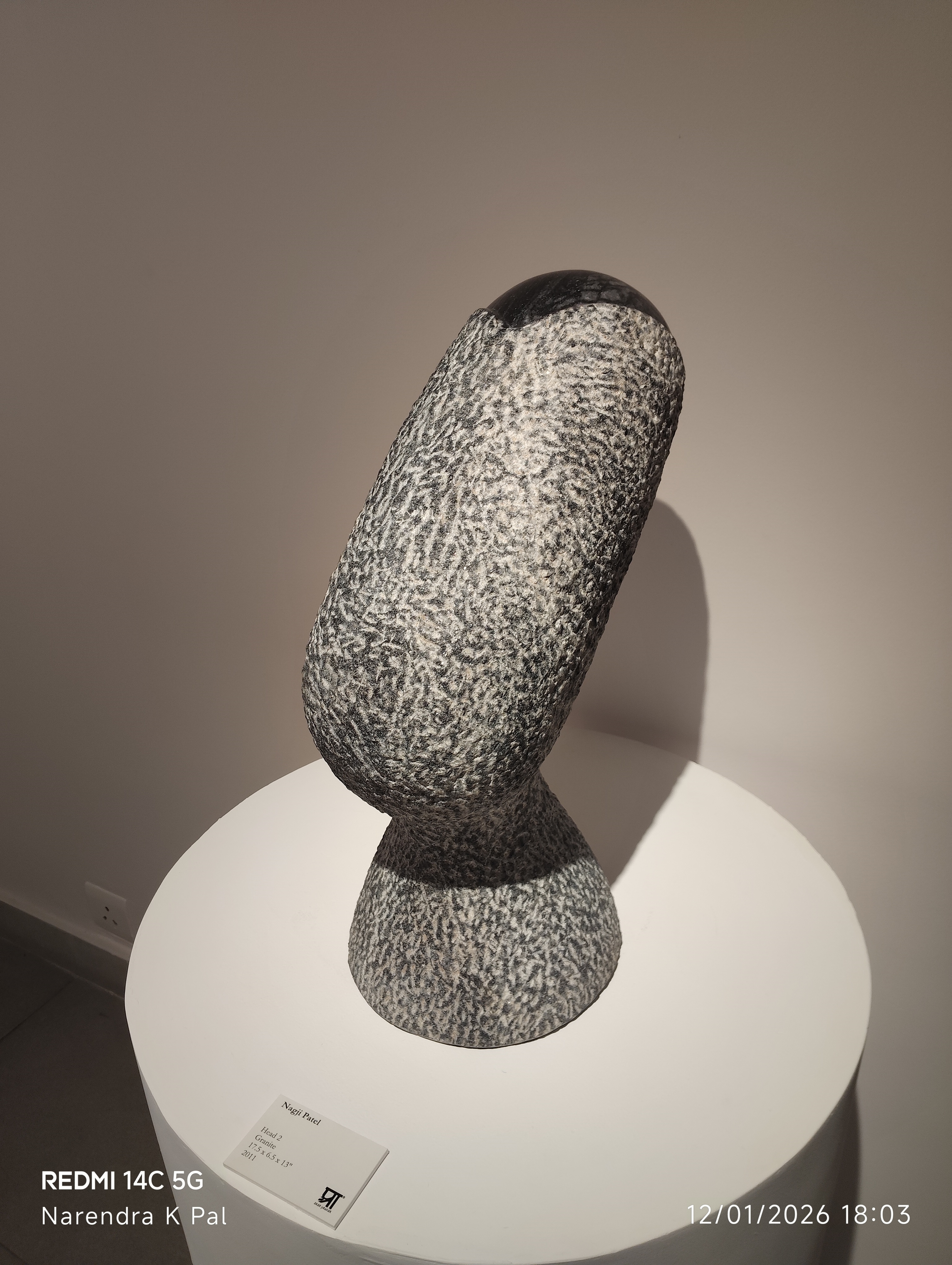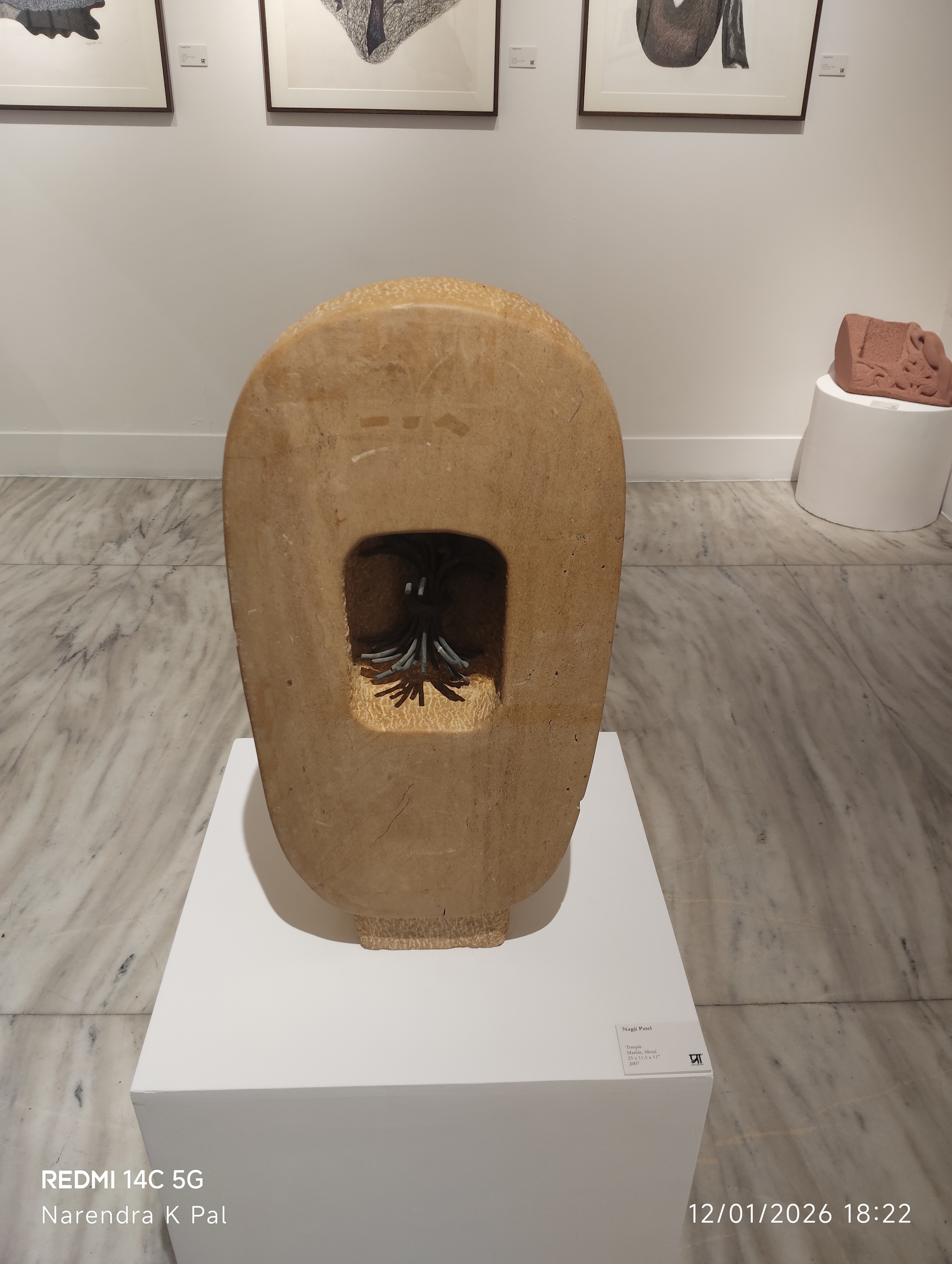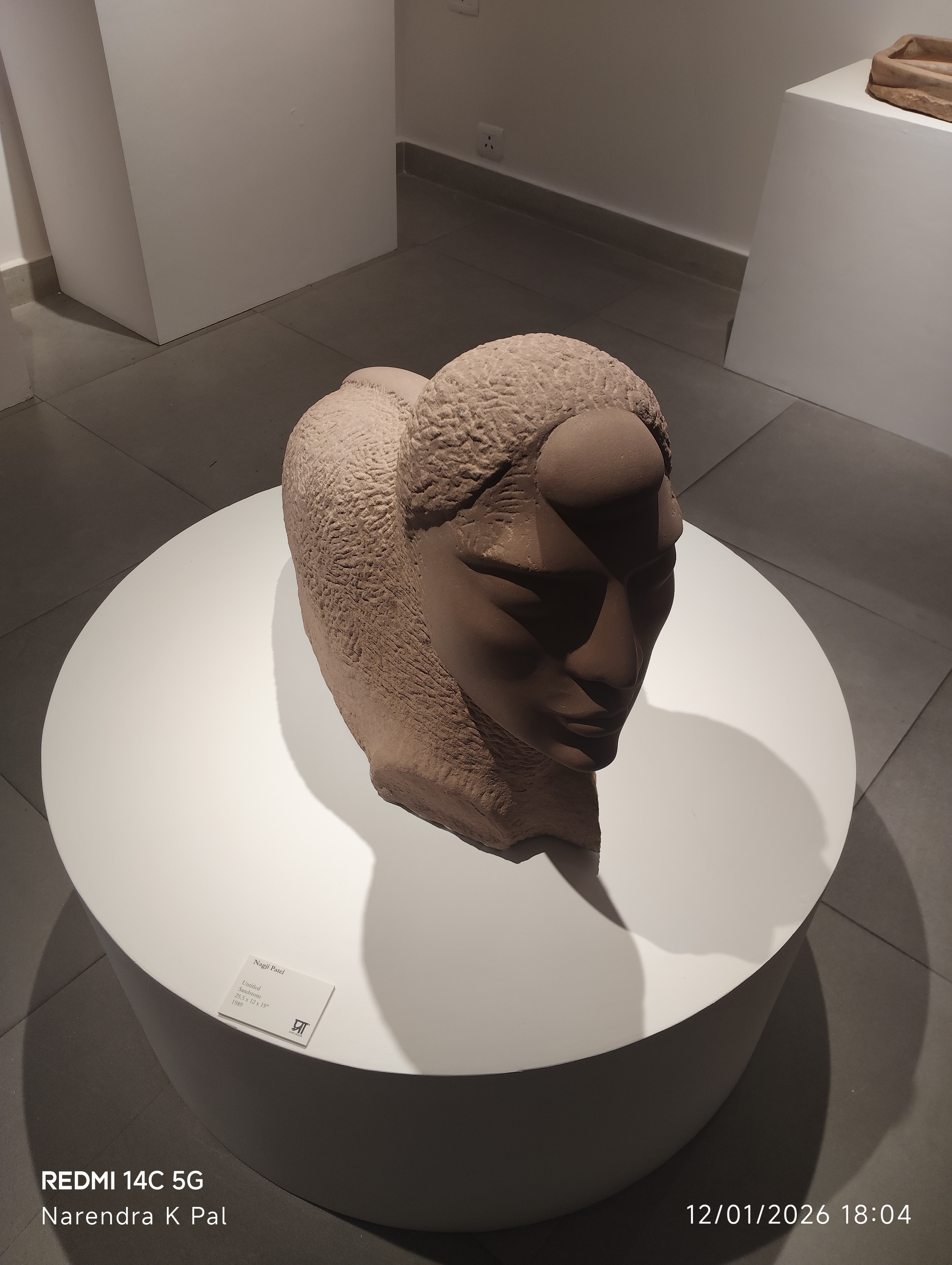 The exhibition features striking sculptural works that explore the dialogue between form and silence. The centerpiece, a textured grey stone sculpture displayed prominently in the promotional poster, exemplifies Patel’s ability to evoke voice and memory through abstract shapes.