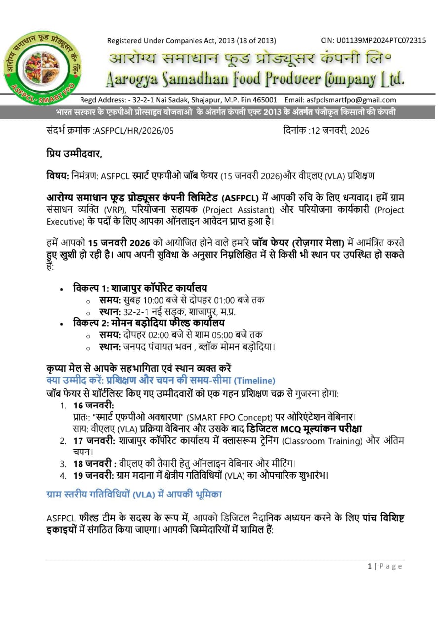 рднрд╛рд░рдд рдЕрдм рдХреЗрд╡рд▓ рд╢рд╣рд░реЛрдВ рдореЗрдВ рдирд╣реАрдВ, рдмрд▓реНрдХрд┐ рдЧрд╛рдБрд╡реЛрдВ рдореЗрдВ рднреА 'рд╕реНрдорд╛рд░реНрдЯ' рд╣реЛрдиреЗ рдЬрд╛ рд░рд╣рд╛ рд╣реИред рдЖрд░реЛрдЧреНрдп рд╕рдорд╛рдзрд╛рди рдлреВрдб рдкреНрд░реЛрдбреНрдпреВрд╕рд░ рдХрдВрдкрдиреА рд▓рд┐. (ASFPCL) рдиреЗ рд╢рд╛рдЬрд╛рдкреБрд░ рдмреНрд▓реЙрдХ рдХреЗ рдЧрд╛рдБрд╡реЛрдВ рдХреА рд╕реВрд░рдд рдмрджрд▓рдиреЗ рдХреЗ рд▓рд┐рдП рдПрдХ рдорд╣рд╛-рдЕрднрд┐рдпрд╛рди рдХрд╛ рдЖрдЧрд╛реЫ рдХрд┐рдпрд╛ рд╣реИред рдХрдВрдкрдиреА рдиреЗ 'рд╡рд┐рд▓реЗрдЬ рд▓реЗрд╡рд▓ рдПрдХреНрдЯрд┐рд╡рд┐рд╕реНрдЯ' (VLA) рдФрд░ рд╡рд┐рд▓реЗрдЬ рдХреЛрдСрд░реНрдбрд┐рдиреЗрдЯрд░ рдХреЗ рдкрджреЛрдВ рдкрд░ рд╕реАрдзреА рднрд░реНрддреА (Job Fair) рдХреА рдШреЛрд╖рдгрд╛ рдХреА рд╣реИред