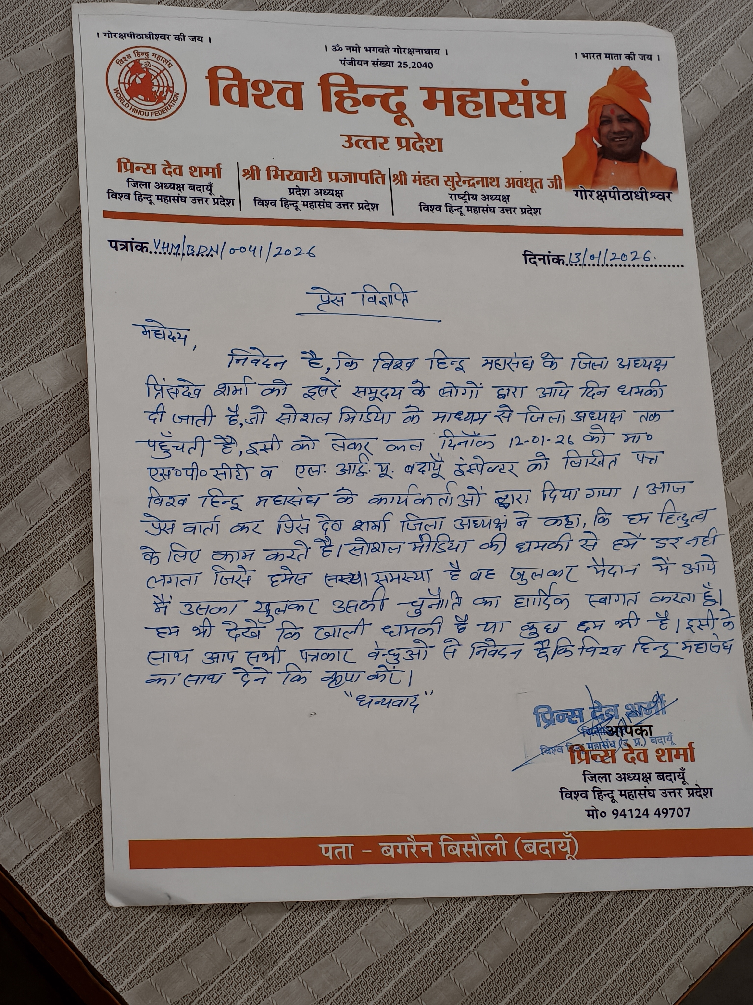 बदायूं को लिखित सूचना देकर सुरक्षा की मांग की और धमकाने वालों के लिए चेताते हुए कहा विश्व हिन्दू महासंघ का कोई भी कार्य करता सोशल मीडिया की गीदड़ धमकियों से नहीं डरता। अगर किसी को ज्यादा आपत्ति है तो खुले मैदान में आकर चुनौती दे हम उसका डटकर सामना करने को हर समय तैयार है। तथा मीडिया बंधुओं से कहा विश्व हिन्दू महासंघ का साथ देने का निवेदन करते हुए अपना पक्ष रखा।