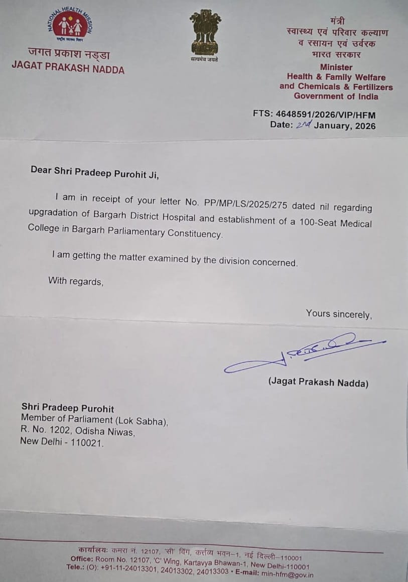 Bargarh Lok Sabha MP Pradeep Purohit had drawn the attention of the government in the last Lok Sabha session to establish a 100-seat medical college in Bargarh in Bargarh district and had met Union Health Minister Jagat Prakash Nadda and submitted a demand letter. The Union Government is considering establishing a medical college in Bargarh, Hon'ble Union Minister Shri Jagat Prakash Nadda has informed MP Pradeep Purohit through a letter.