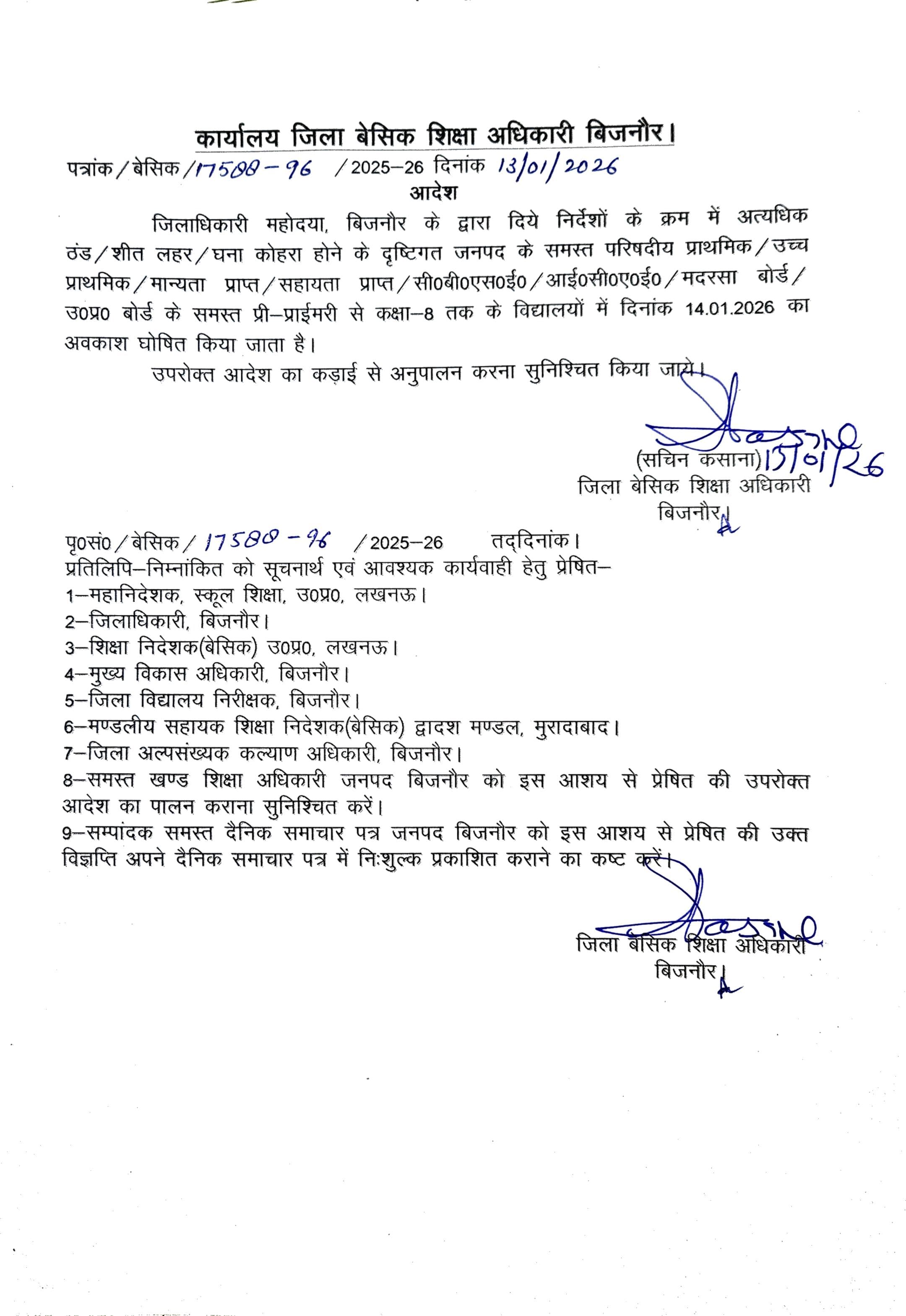 जिले में ठंड और शीतलहर को देखते हुए जिलाधिकारी महोदया, बिजनौर के द्वारा दिये निर्देशों के क्रम में बेसिक शिक्षा अधिकारी बिजनौर द्वारा अत्यधिक ठंड/शीत लहर/घना कोहरा होने के दृष्टिगत जनपद के समस्त परिषदीय प्राथमिक/उच्च प्राथमिक / मान्यता प्राप्त / सहायता प्राप्त / सी०बी०एस०ई०/आई०सी०ए०ई० / मदरसा बोर्ड /उ०प्र० बोर्ड के समस्त प्री-प्राईमरी से कक्षा-8 तक के विद्यालयों में दिनांक 14 जनवरी का अवकाश घोषित किया गया है। उपरोक्त आदेश का कड़ाई से अनुपालन करने के निर्देश दिए गए है.