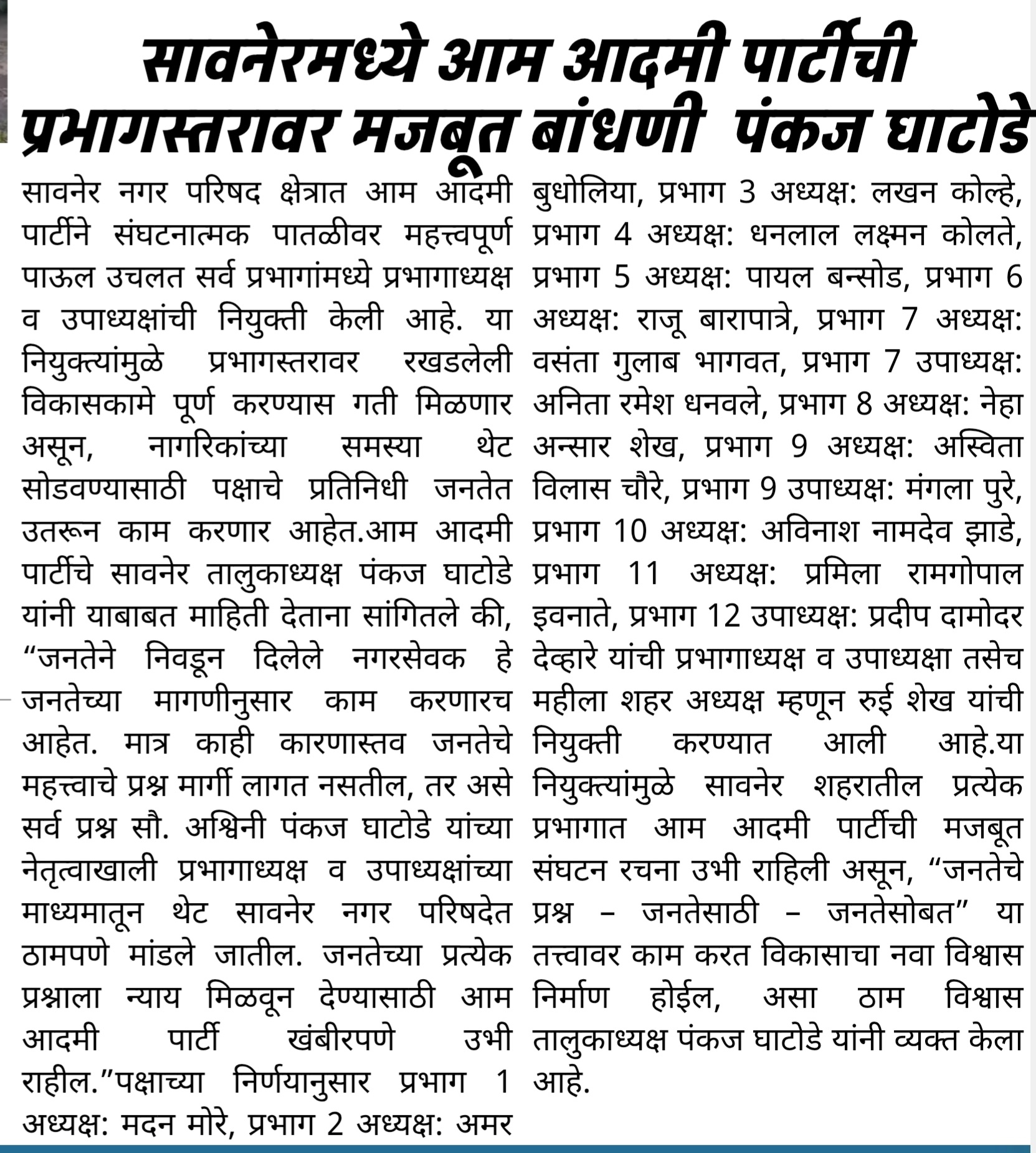 सावनेरमध्ये आम आदमी पार्टीची प्रभागस्तरावर मजबूत बांधणी पंकज घाटोडे