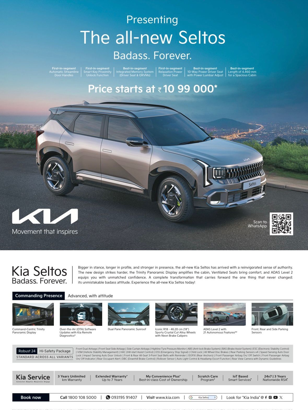 किया सेल्टोस की लांचिंग 11 जनवरी 2026 को, जिसकी शुरुआती कीमत 10,99,000 रुपये (एक्स-शोरूम) है l